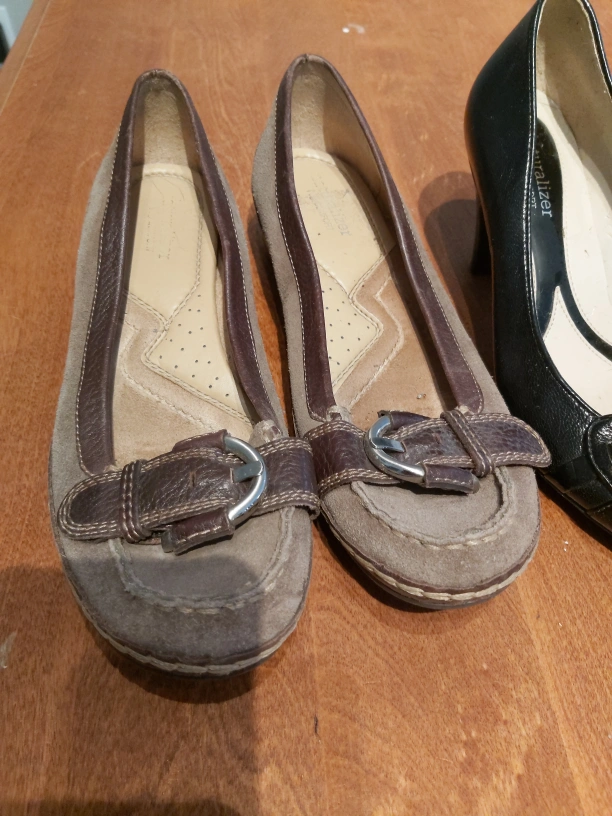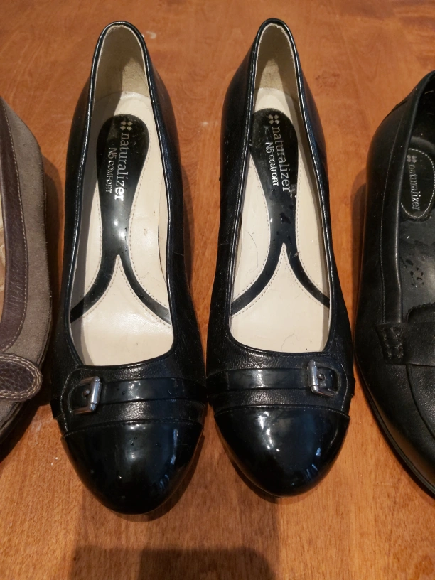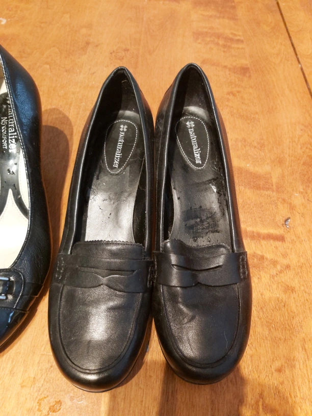 Three pairs of Naturalizer women's shoes. One pair black leather pumps, one pair taupe suede loafers, one pair black leather wedge. Size 7. Price is for all 3. Cash only.