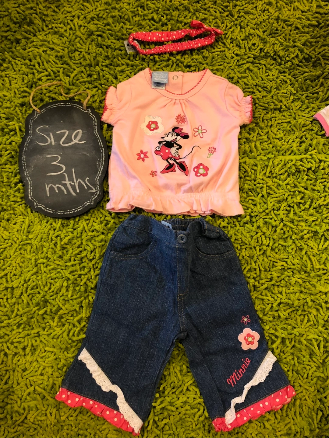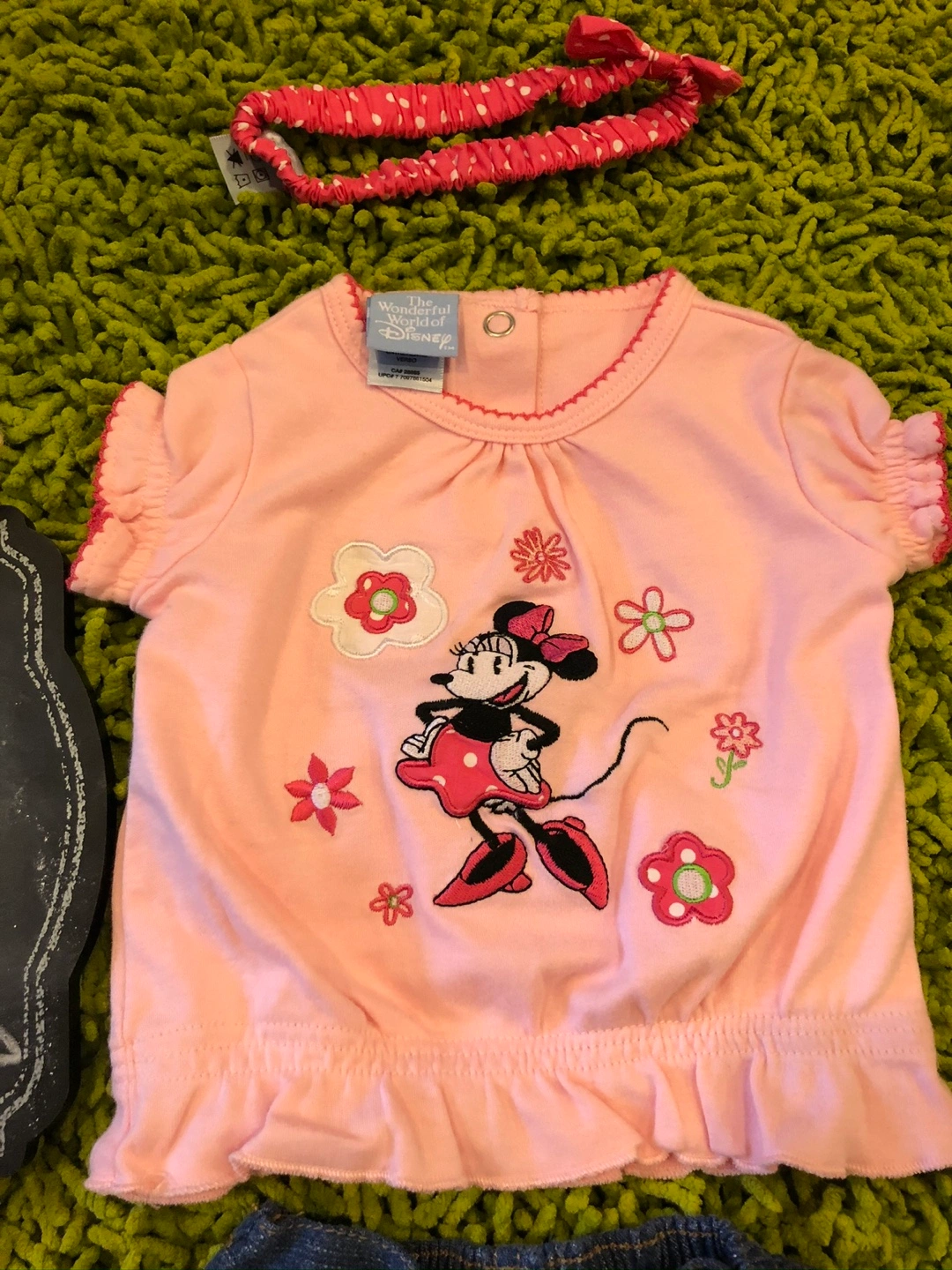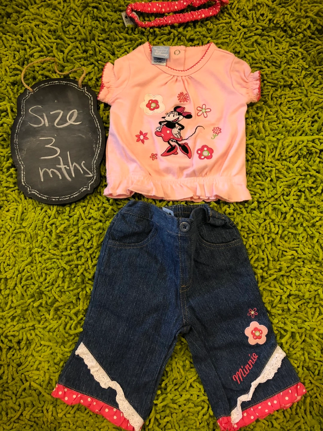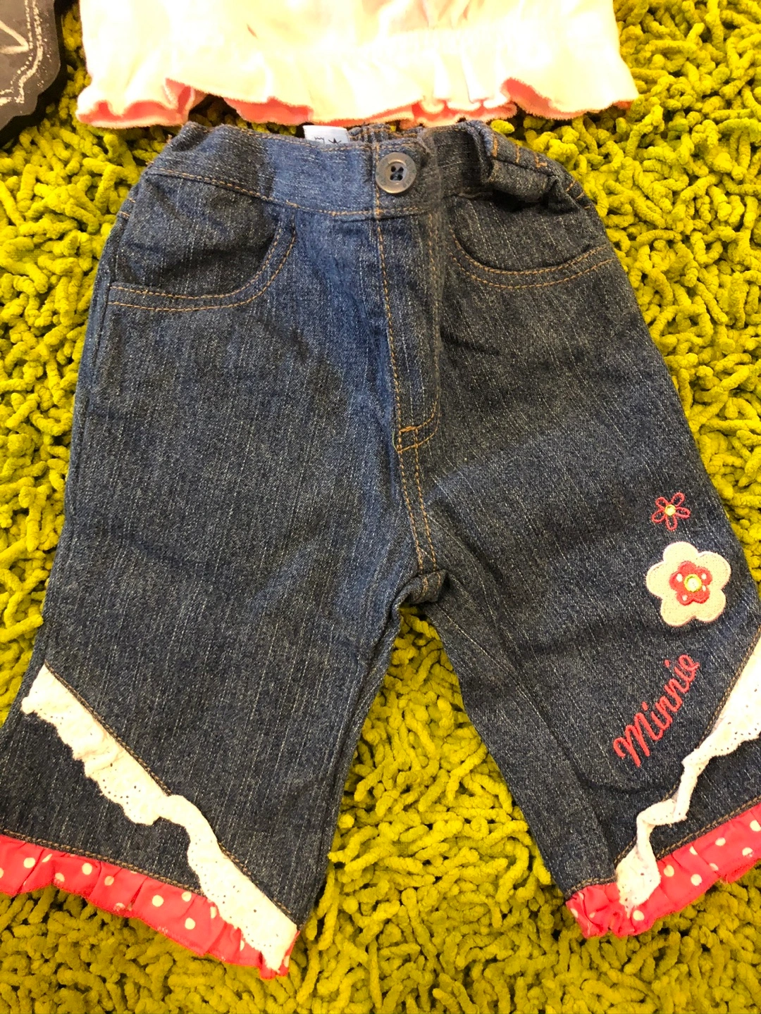 Disney girls - Pink Minnie Mouse shirt with a matching headband and denim pants with lace trim.