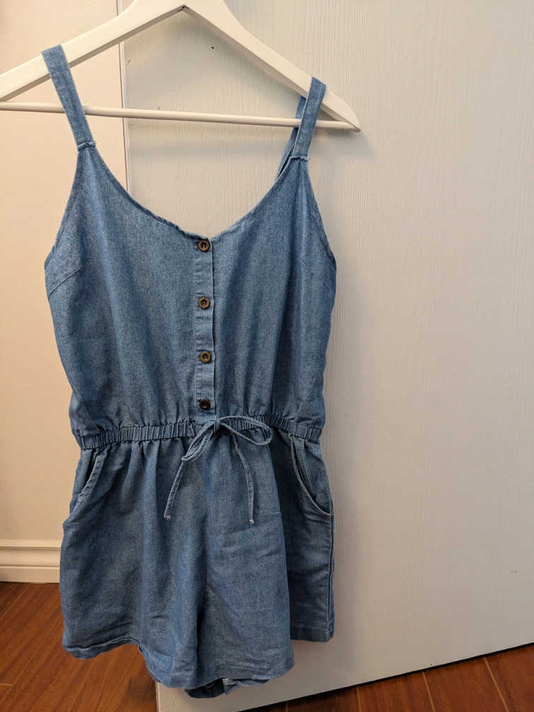 525i believe its cotton actually but cute style with pockets, adjustable shoulder straps, and cinched waist. size xs-s