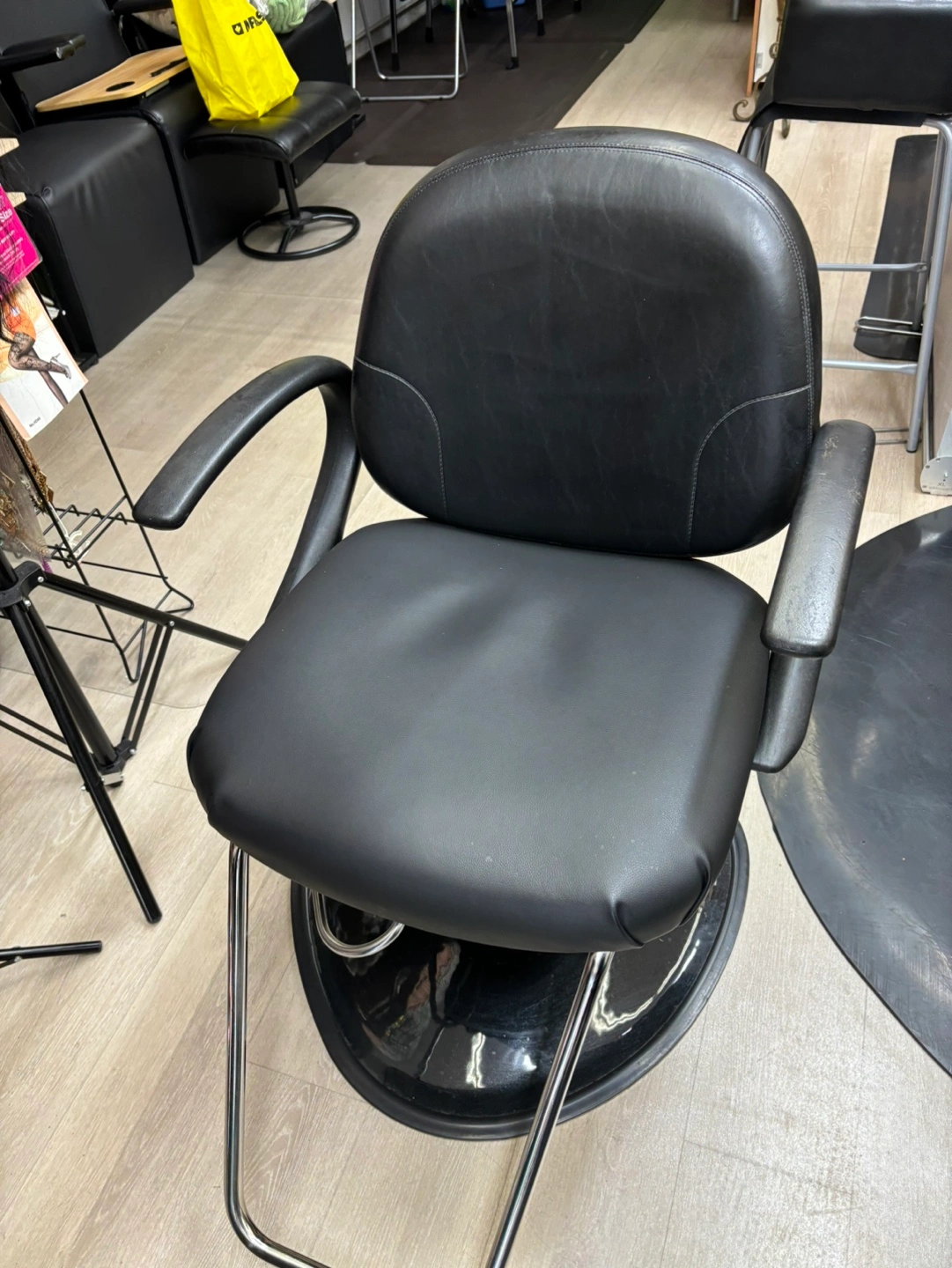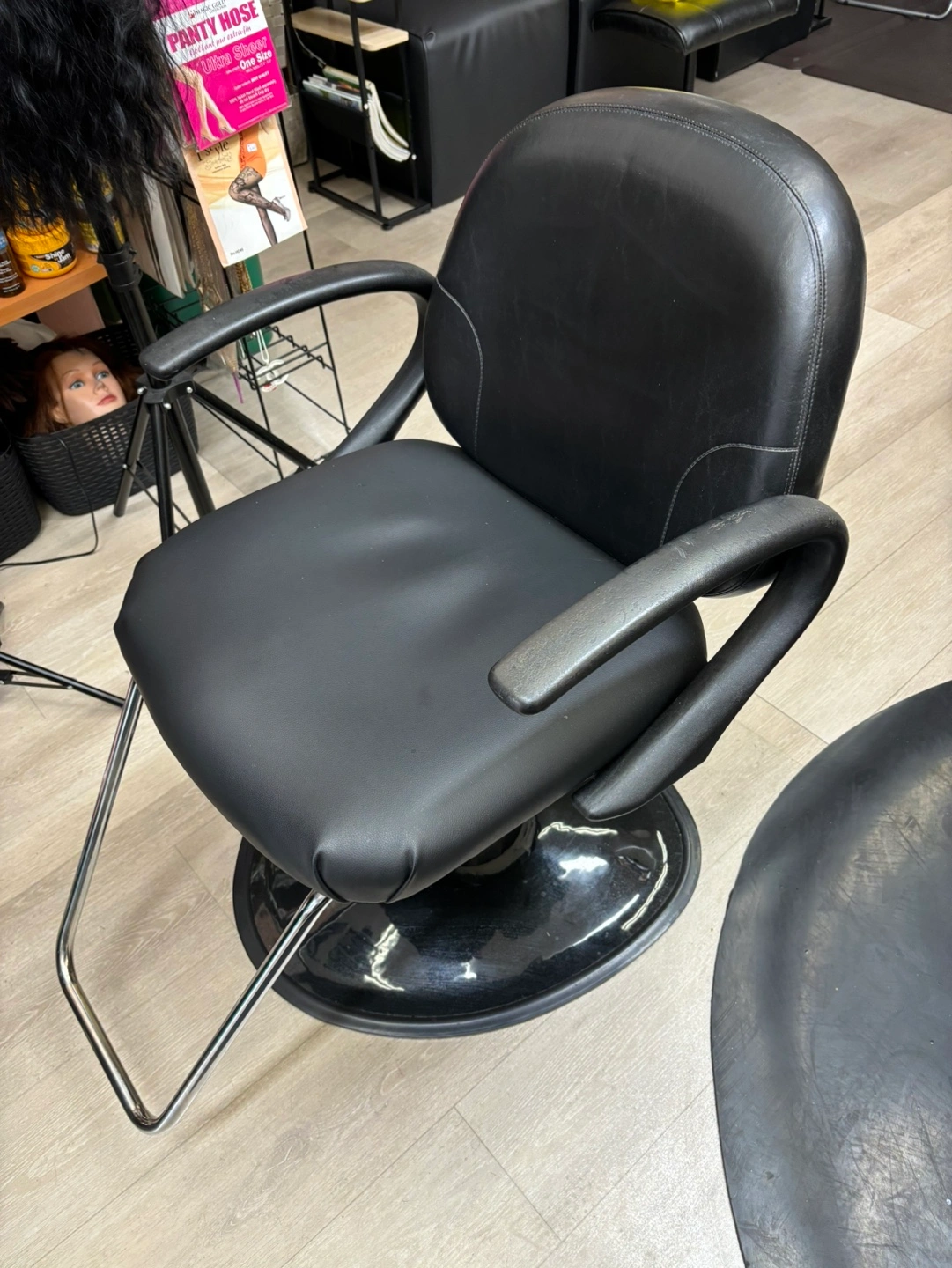 Black salon barber chair. Has chrome base and armrests. In good condition. Replacement leather cover done over a year ago