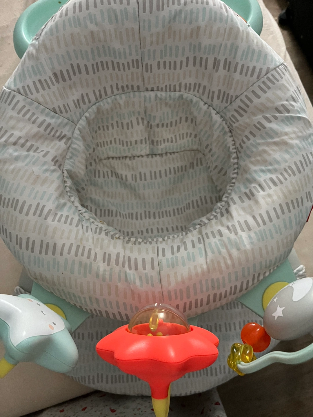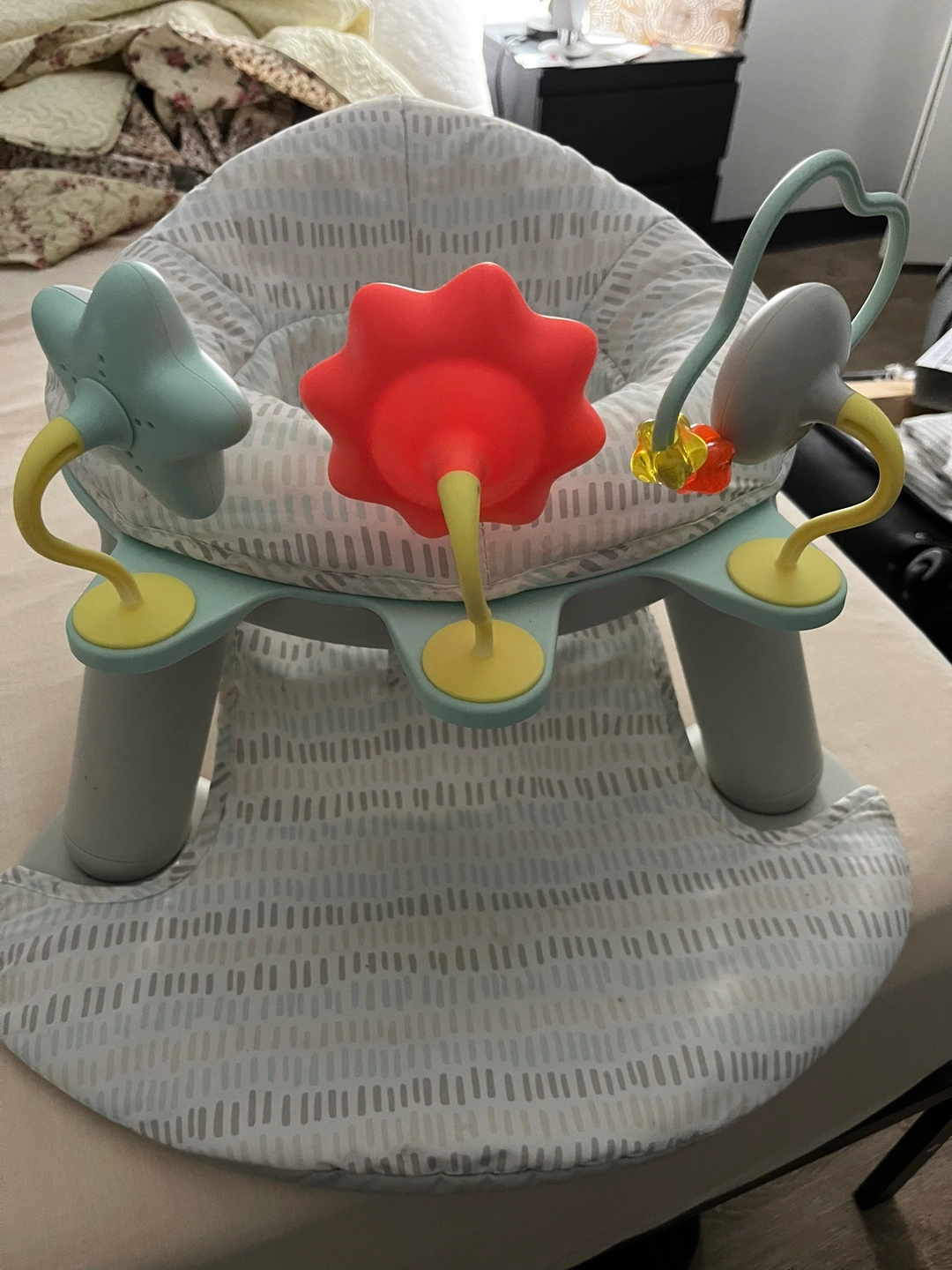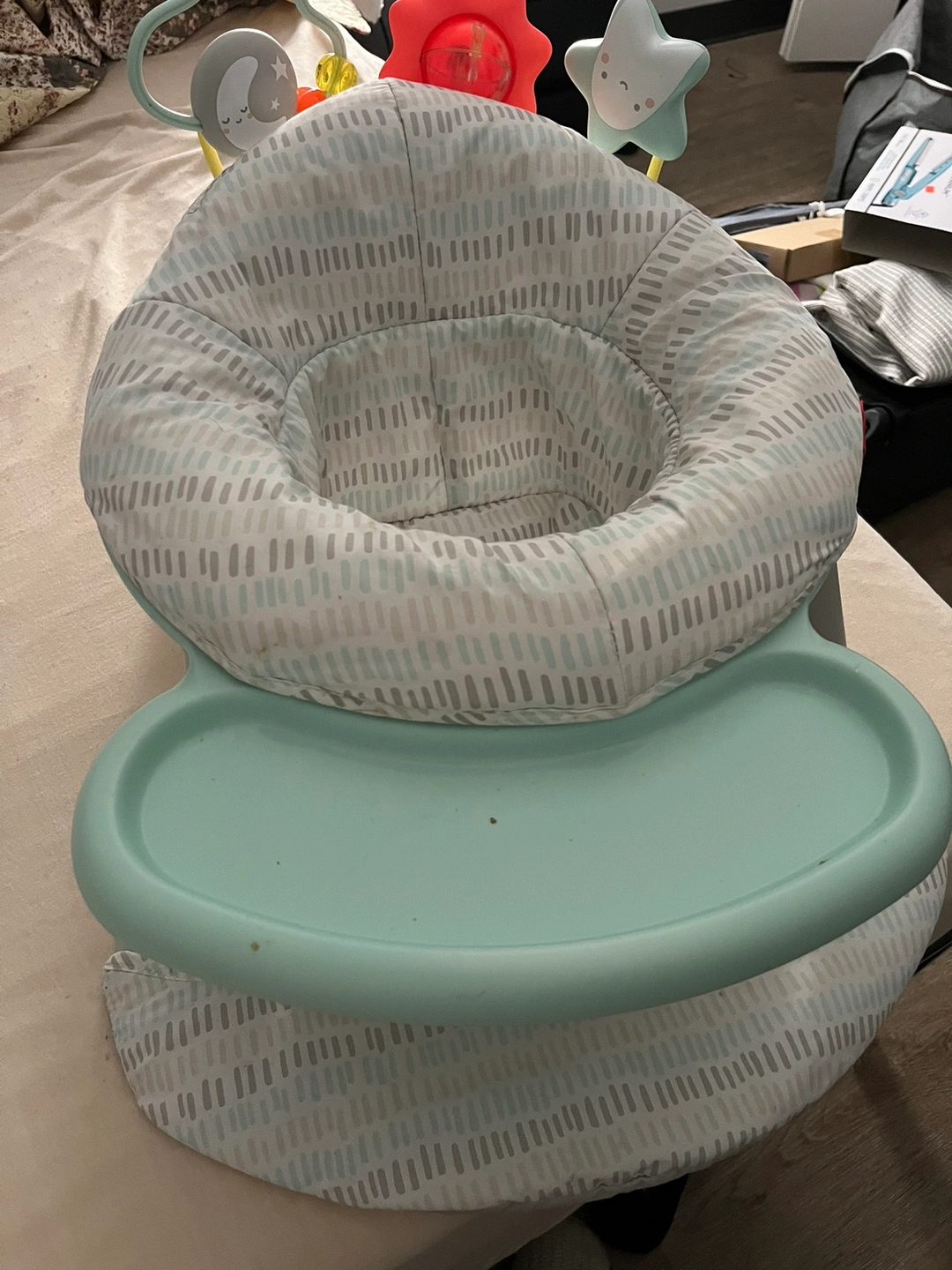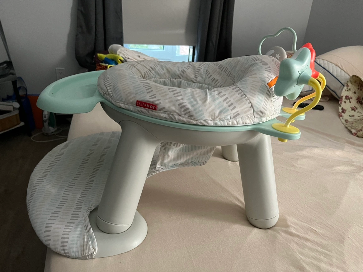 Baby activity center with a tray, toys, and a soft seat. Used, good condition.