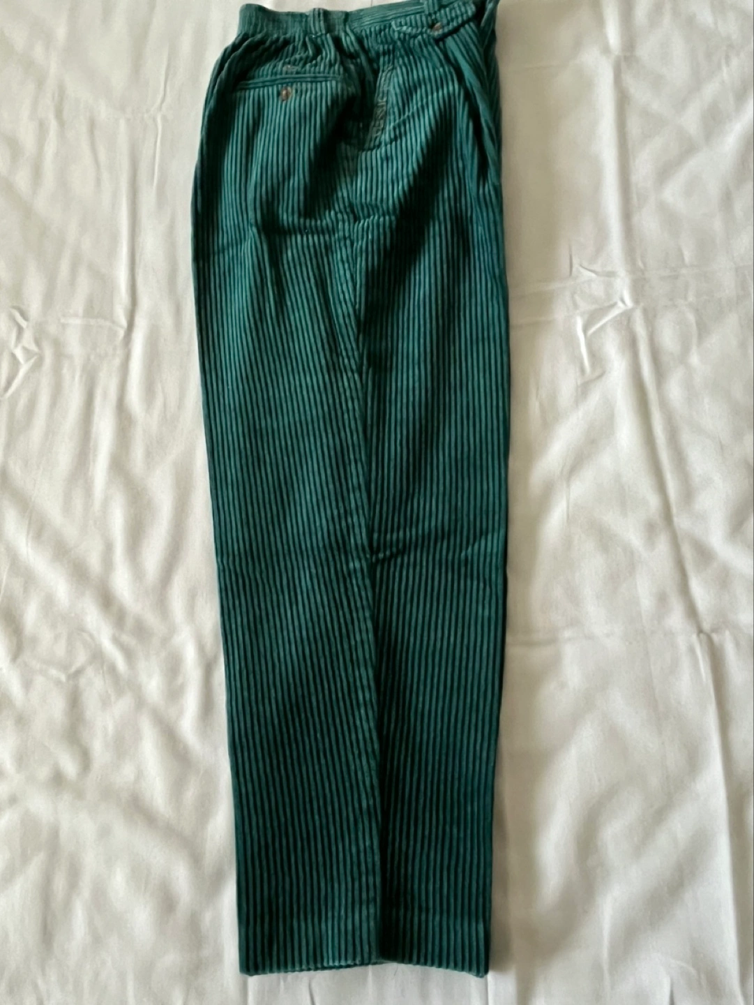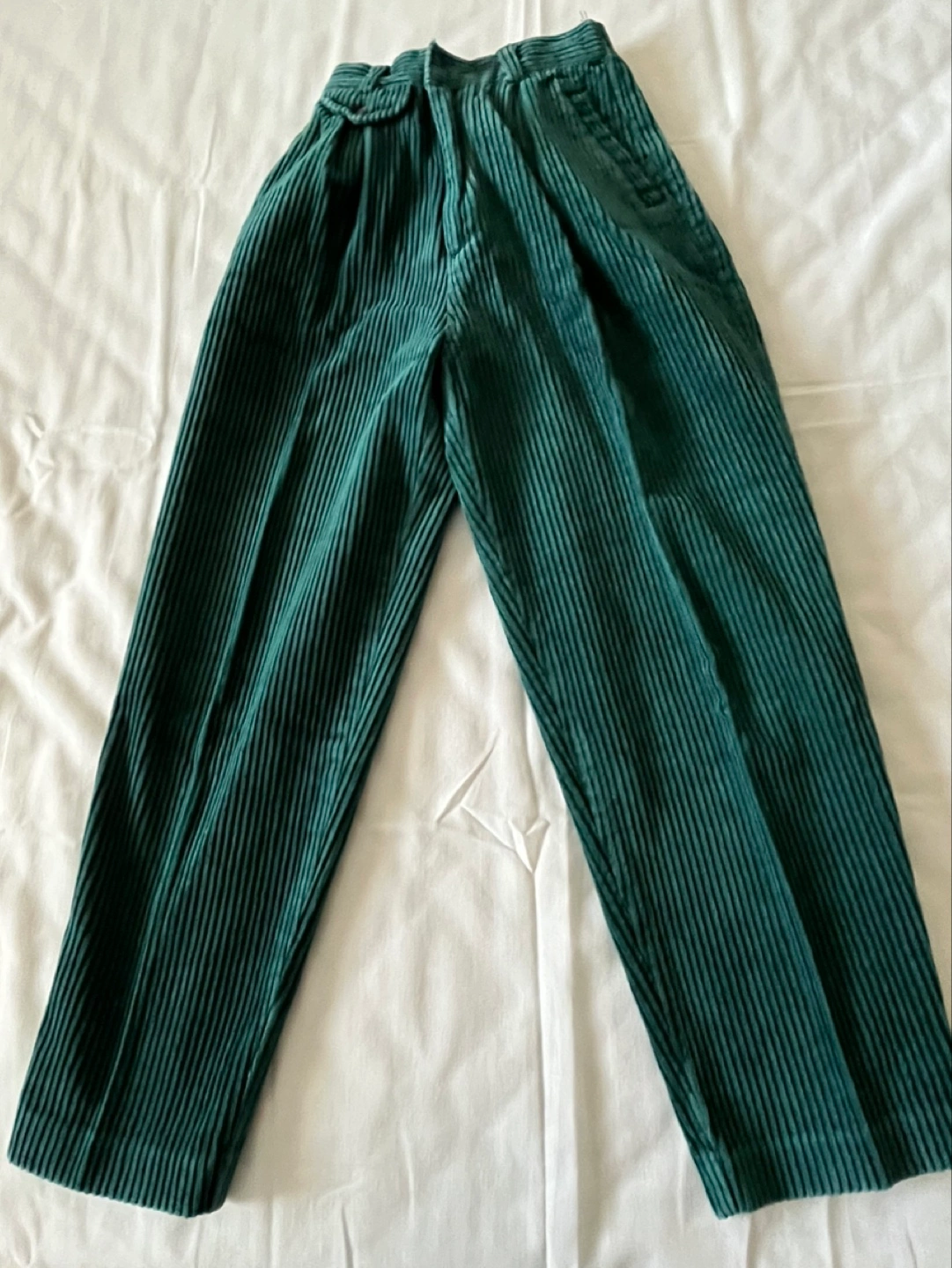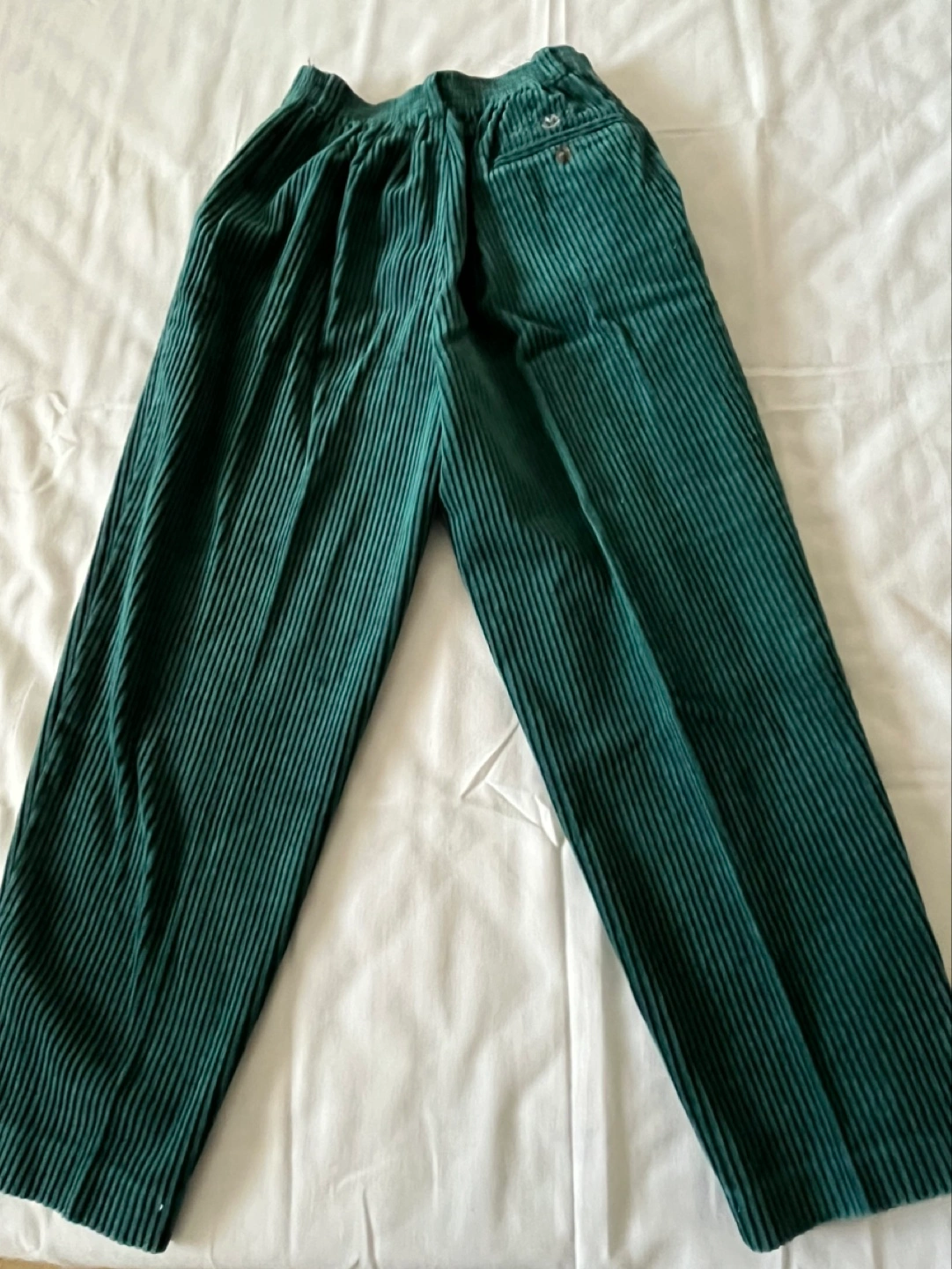 Green corduroy pants, pleated, flat front. Elastic waistband at the back. Size 12. In good condition. If ad is up, the item is available.