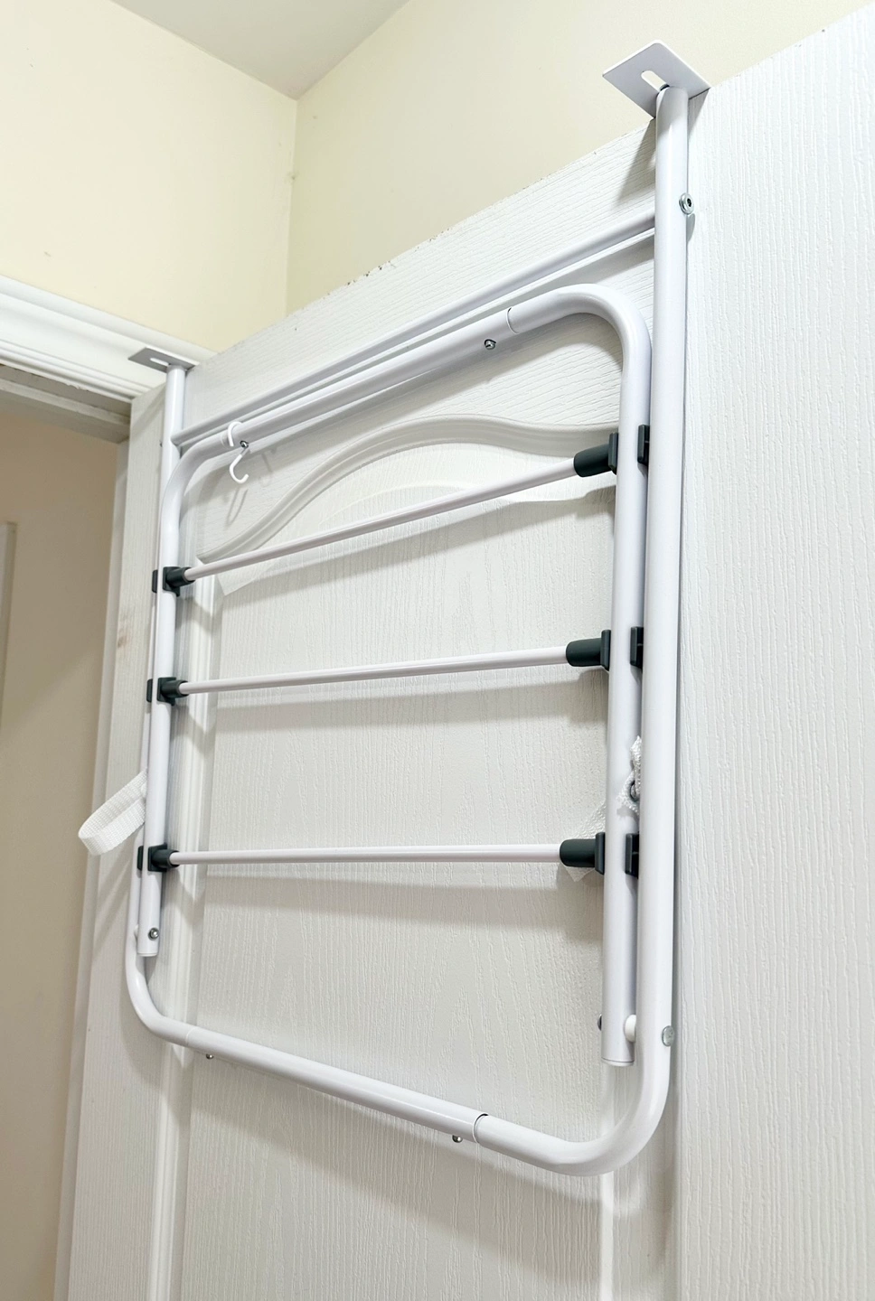 White over the door drying rack. Four bars for hanging clothes or towels. Just brought in June 2024, Moving out of country so selling cheap. Comes with original packaging.