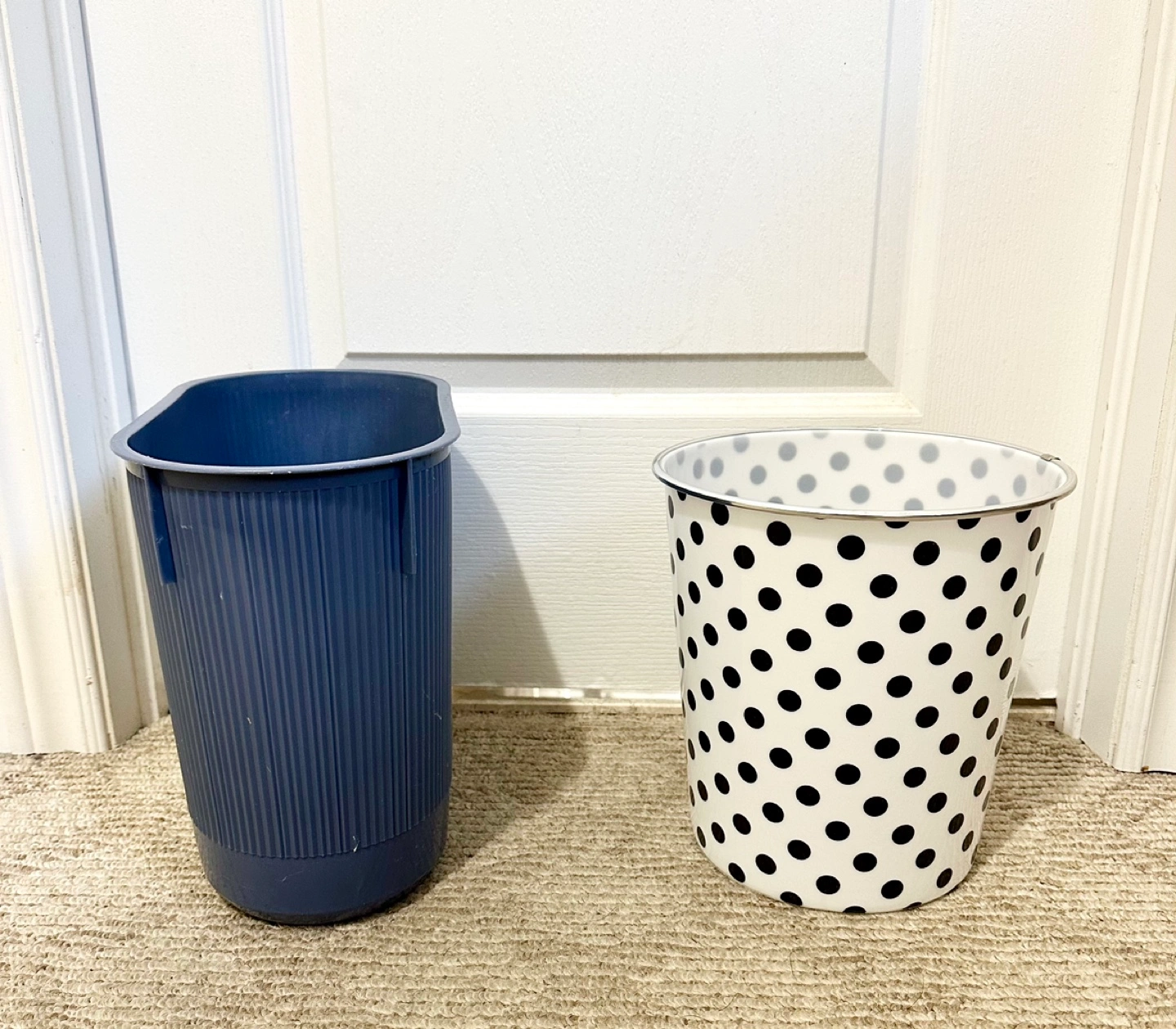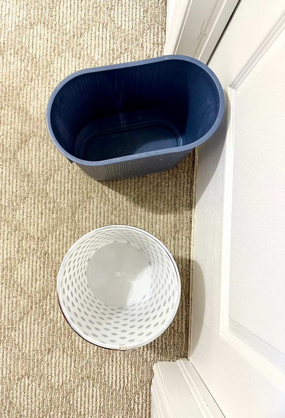 Two trash cans, one blue and one white with black polka dots. Both are in very good condition. Just brought it in June 2024, moving out of country so selling it cheap.