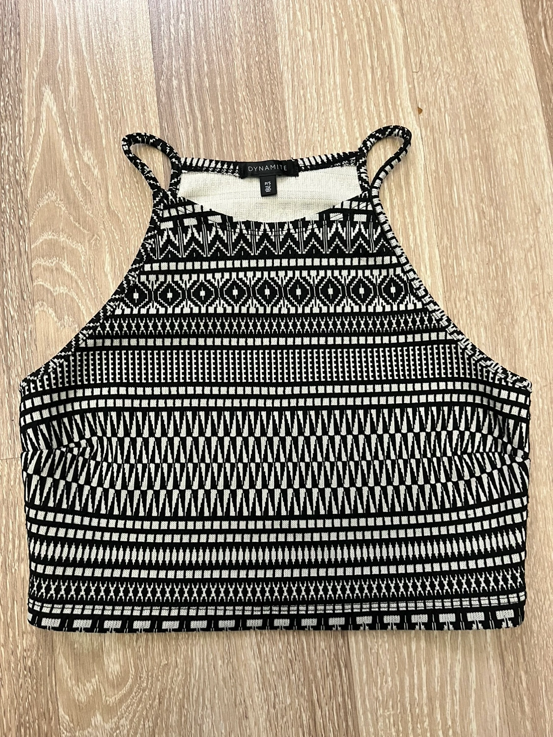 Black and white patterned crop top. Halter style with a high neck. Made of a stretchy material.
