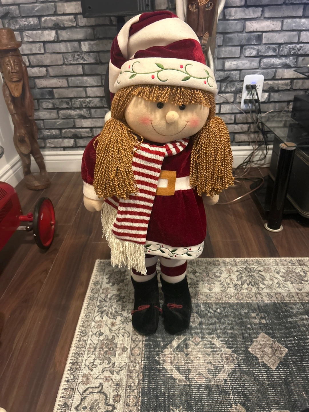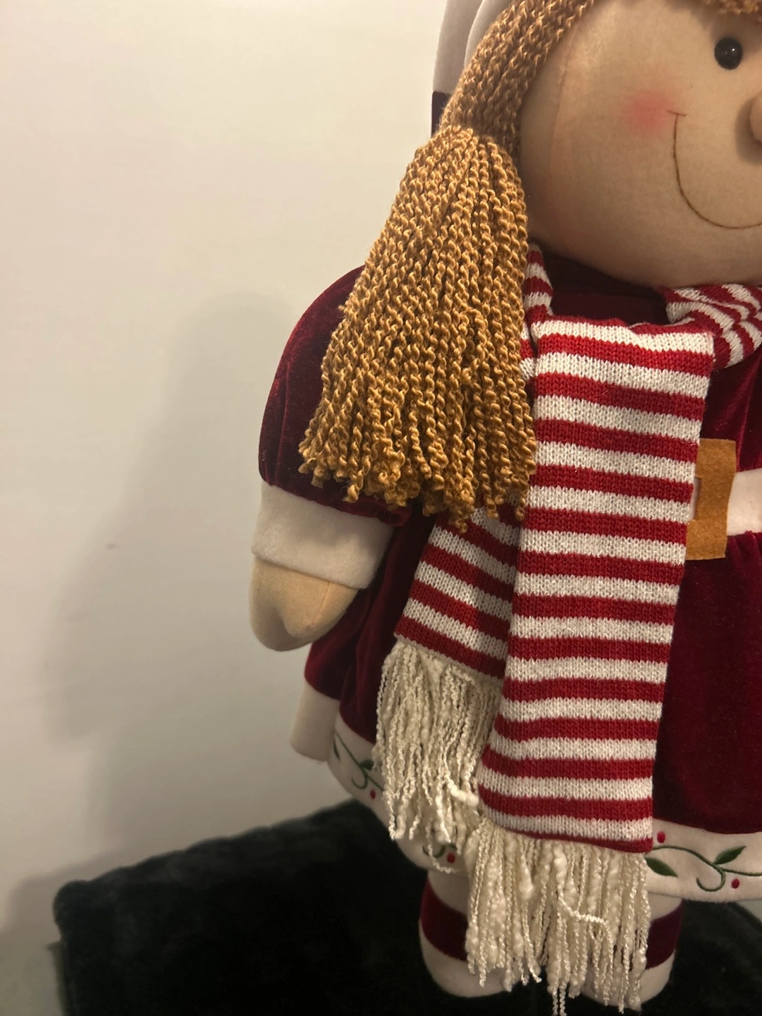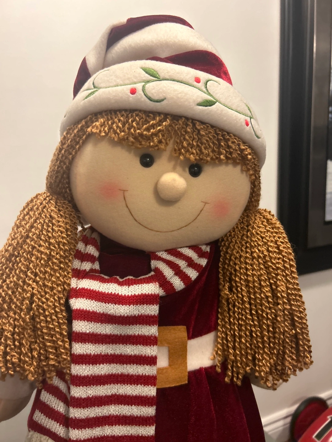 Large plush Christmas elf doll. Red velvet dress and hat with white trim, white and red striped scarf. Long brown hair.