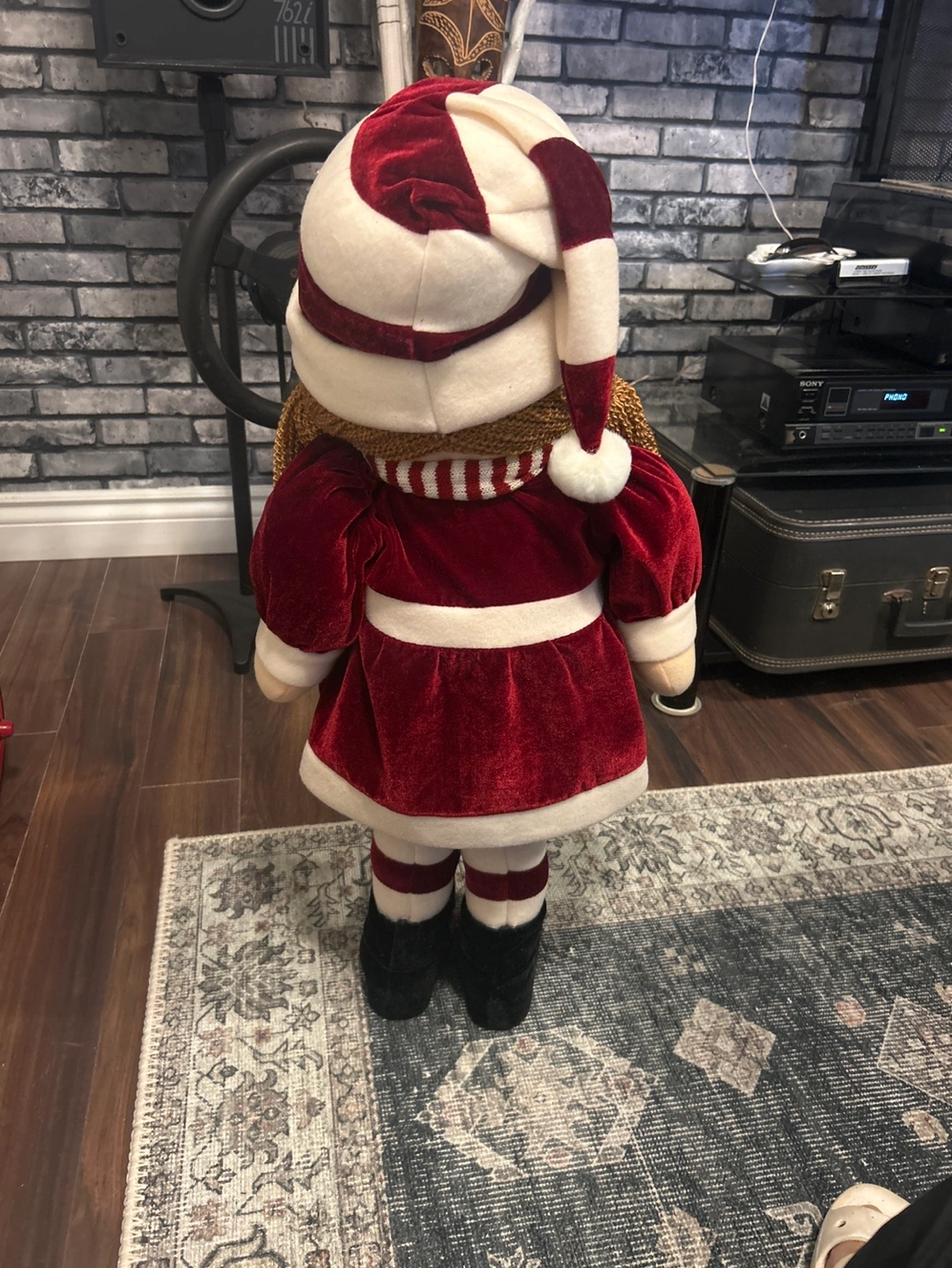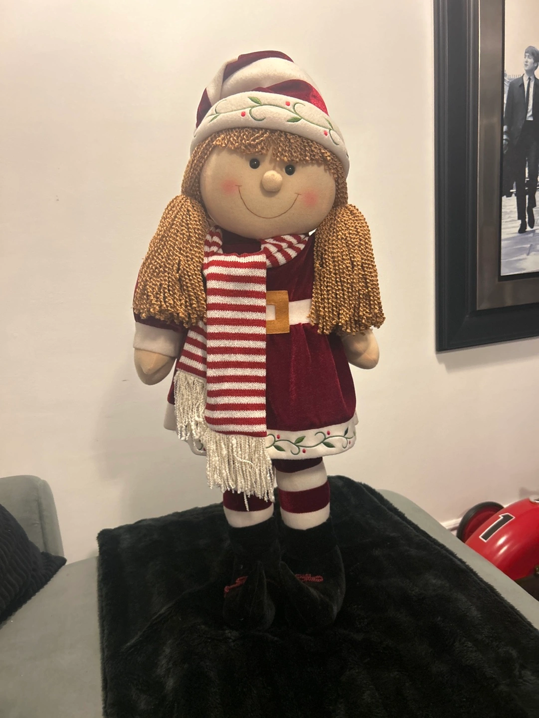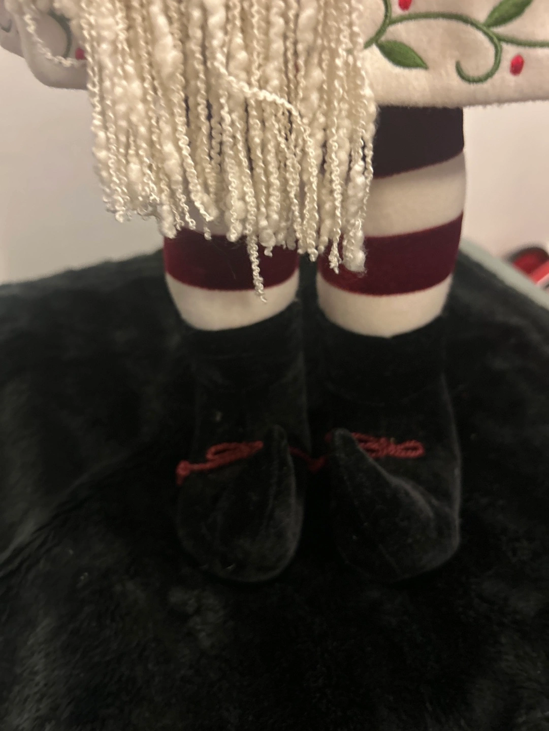 Large plush Christmas elf doll. Red velvet dress and hat with white trim, white and red striped scarf. Long brown hair.