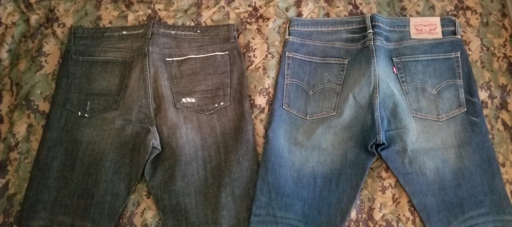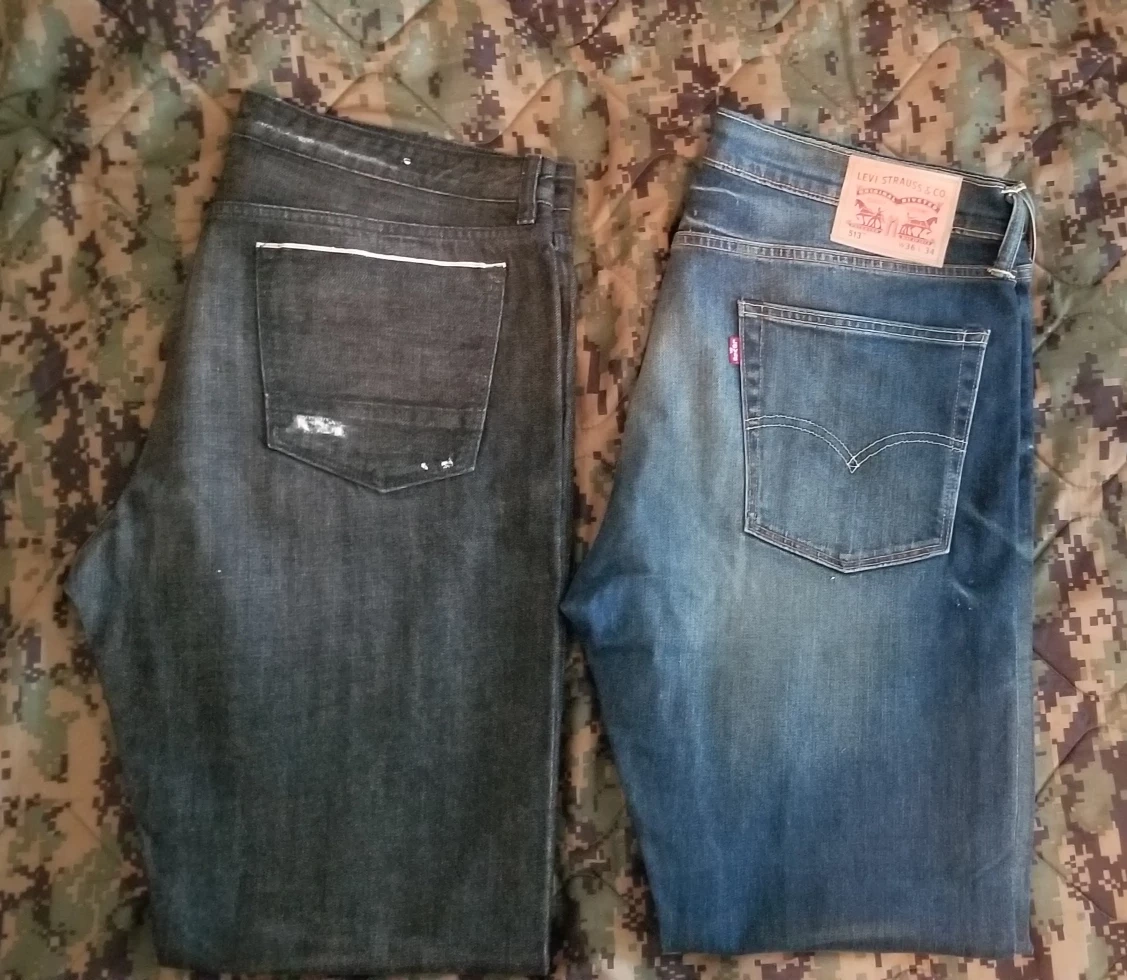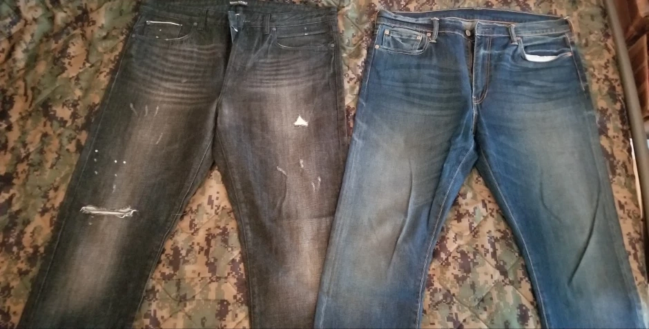 Two pairs of men's jeans, one black pair and one blue pair. The black pair has distressed areas. Both pairs appear to be in good condition.