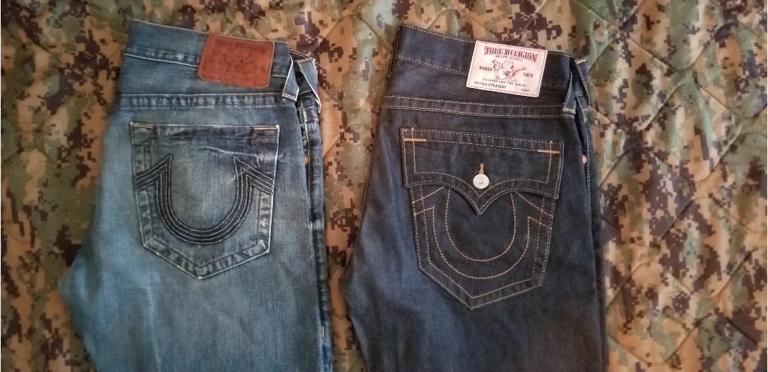 Two pairs of True Religion jeans, one blue and one black. Both are size 36. The blue pair has distressing and a patch on the knees.