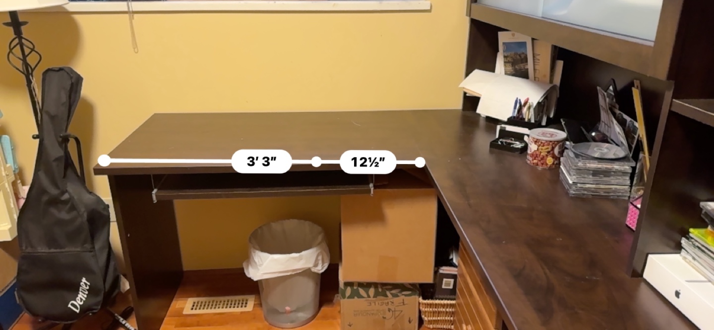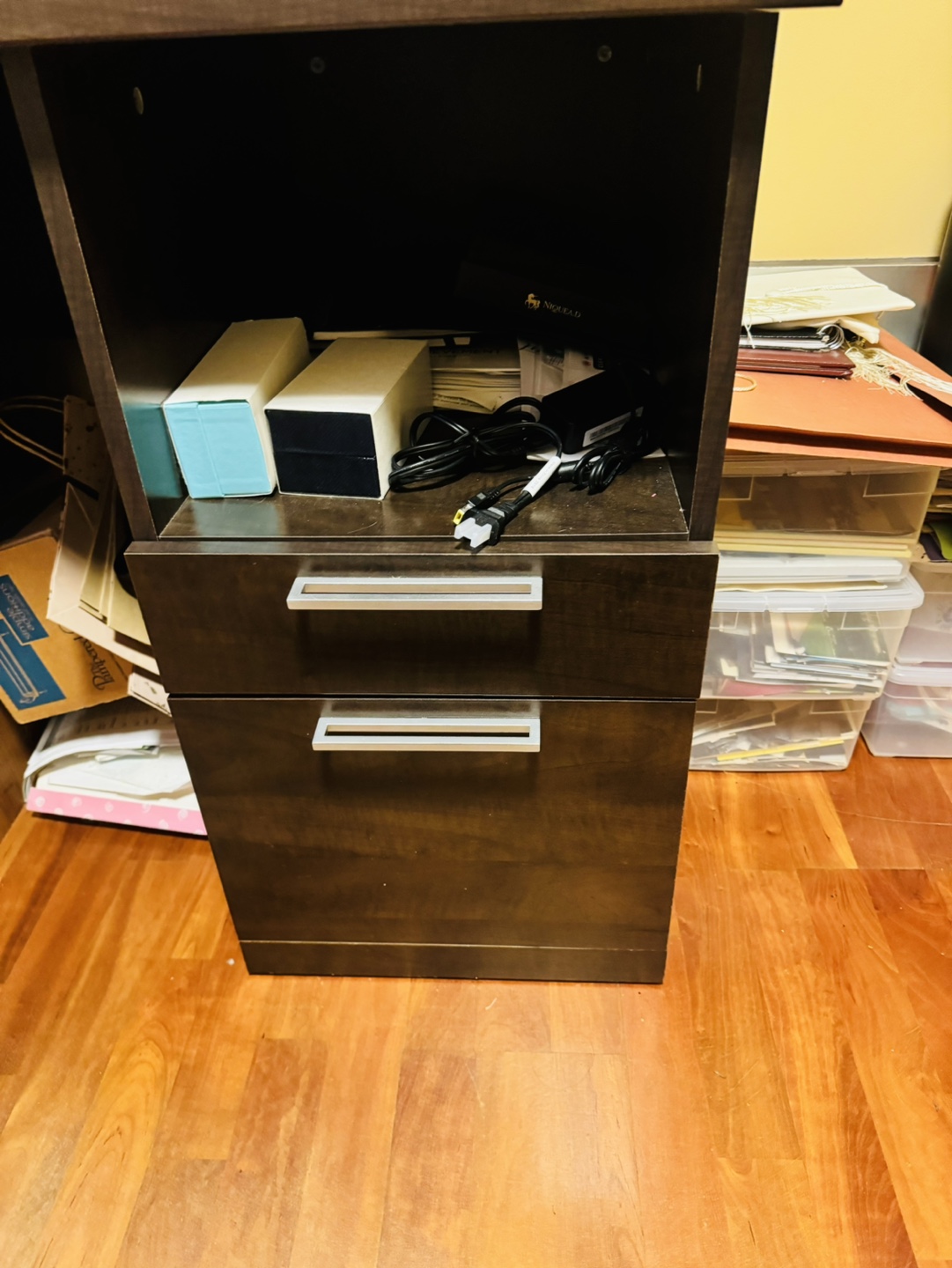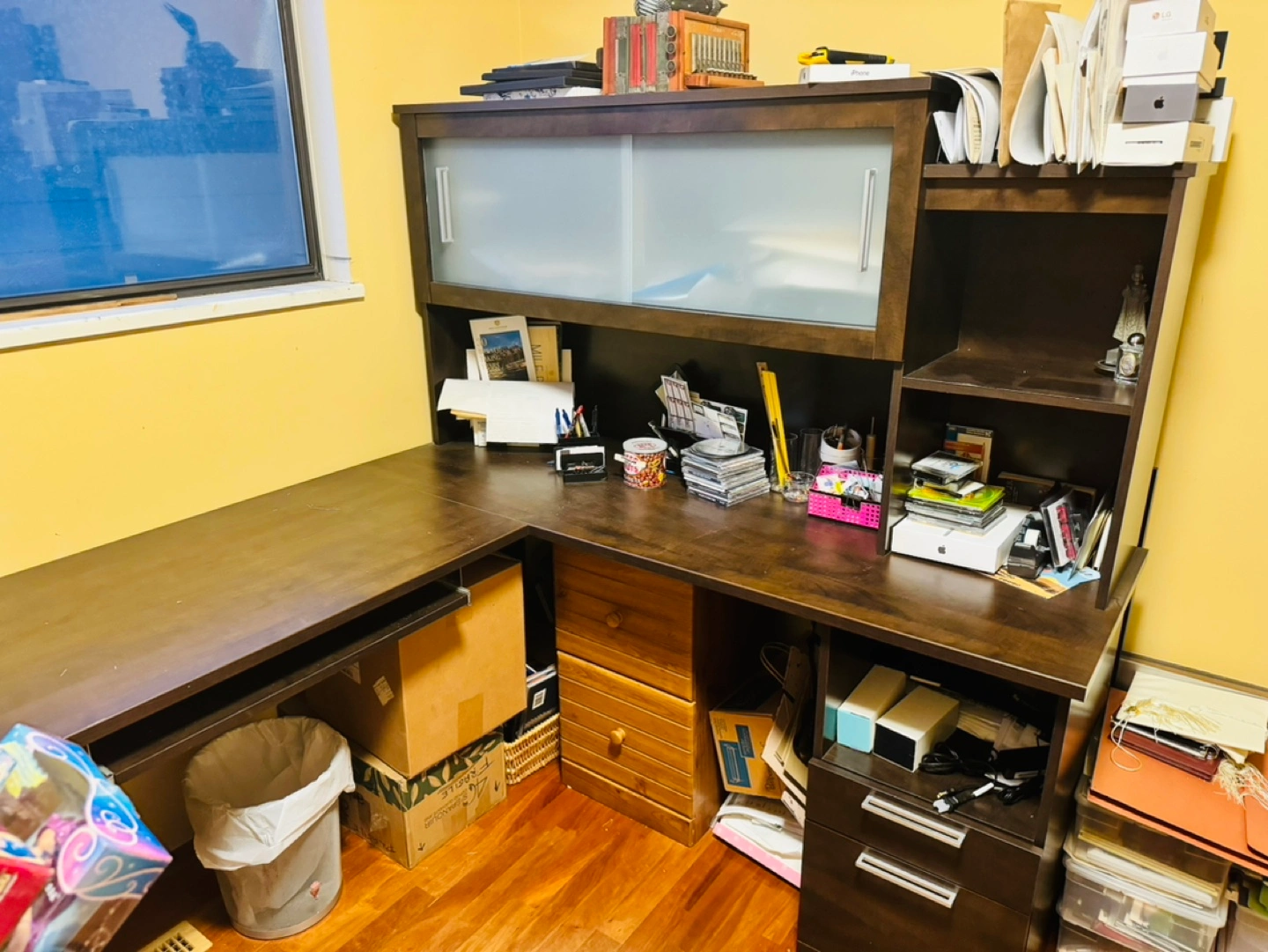 Brown corner desk with hutch. Two drawers on each side. Glass doors on hutch. Measurements provided in images.