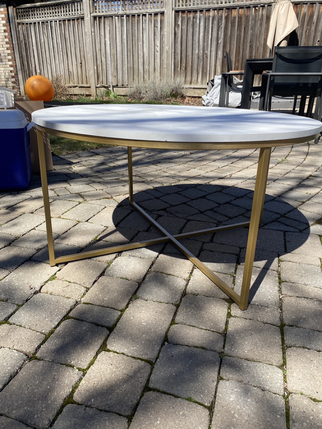 Round coffee table with a white top and gold legs. Faux marble look, but MDF top.