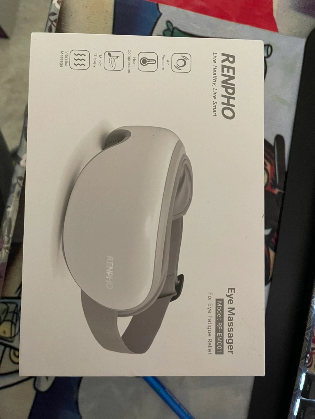 Eye massager with heat, pressure, vibration, and music therapy.