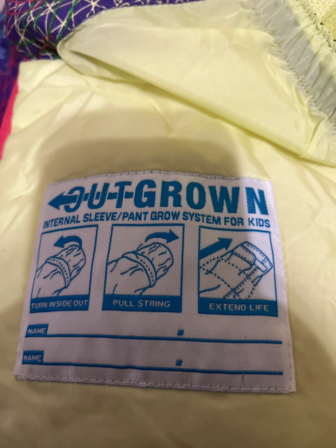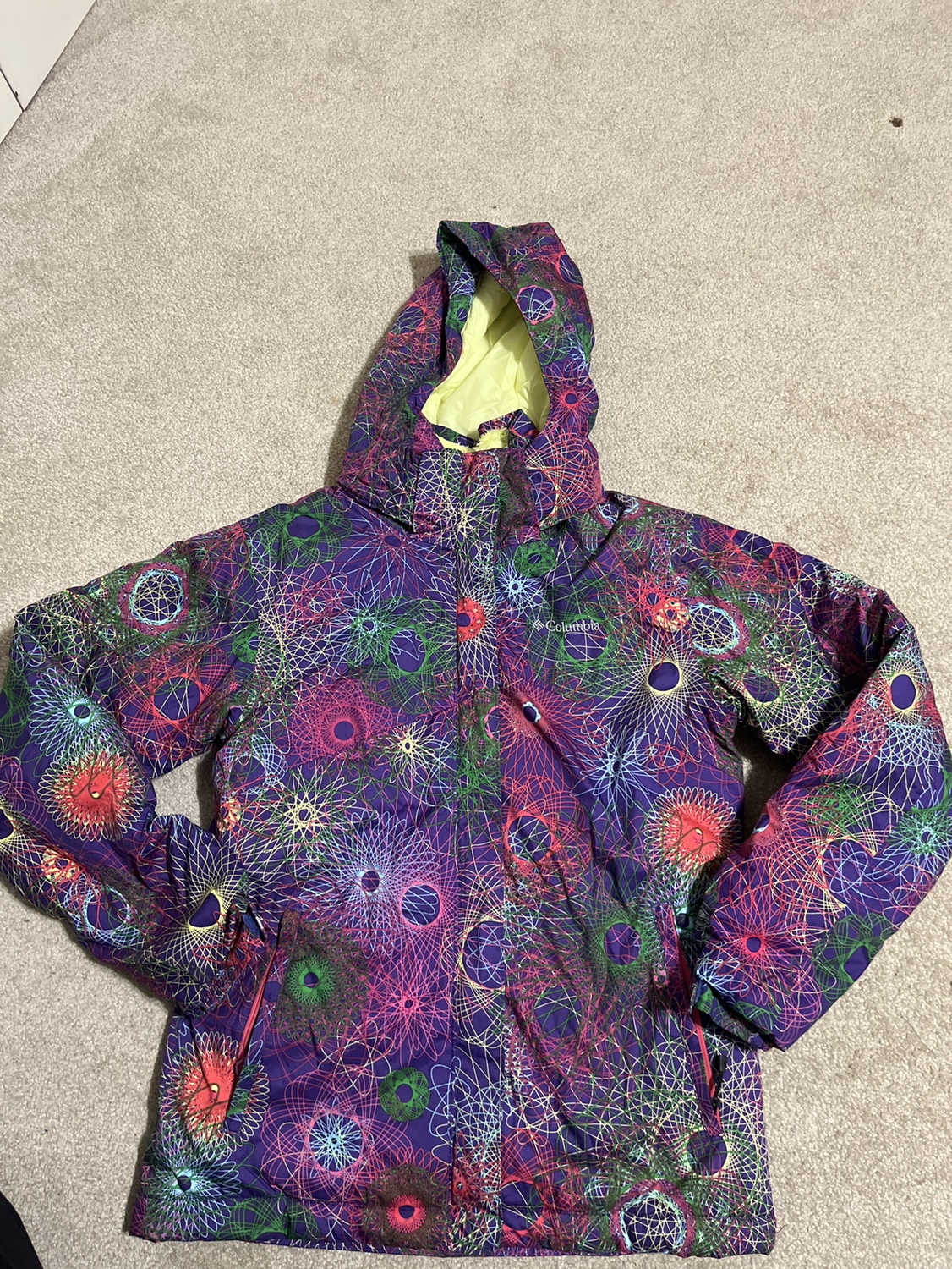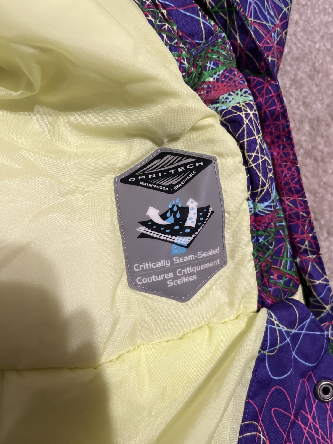 Purple and green patterned jacket with a hood. Omni-Tech waterproof and breathable fabric. Size 14/16. Has an internal sleeve/grow system. Clean and no rips or stains.