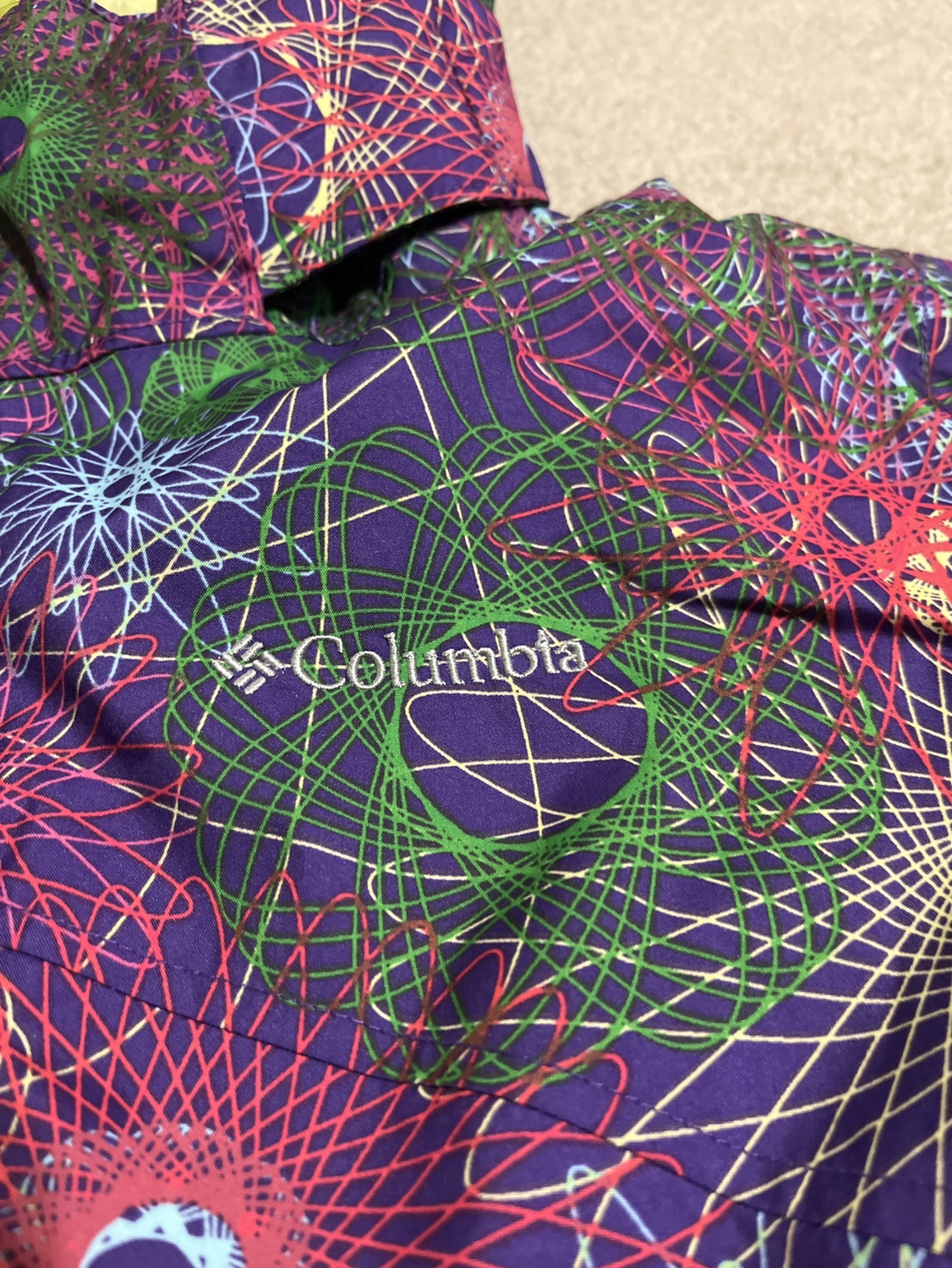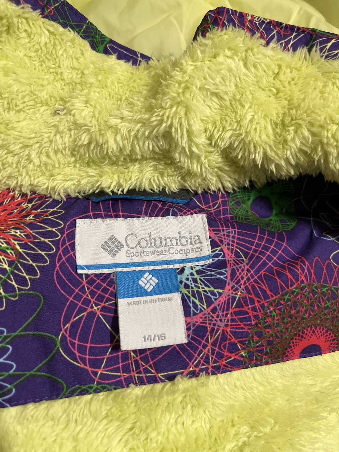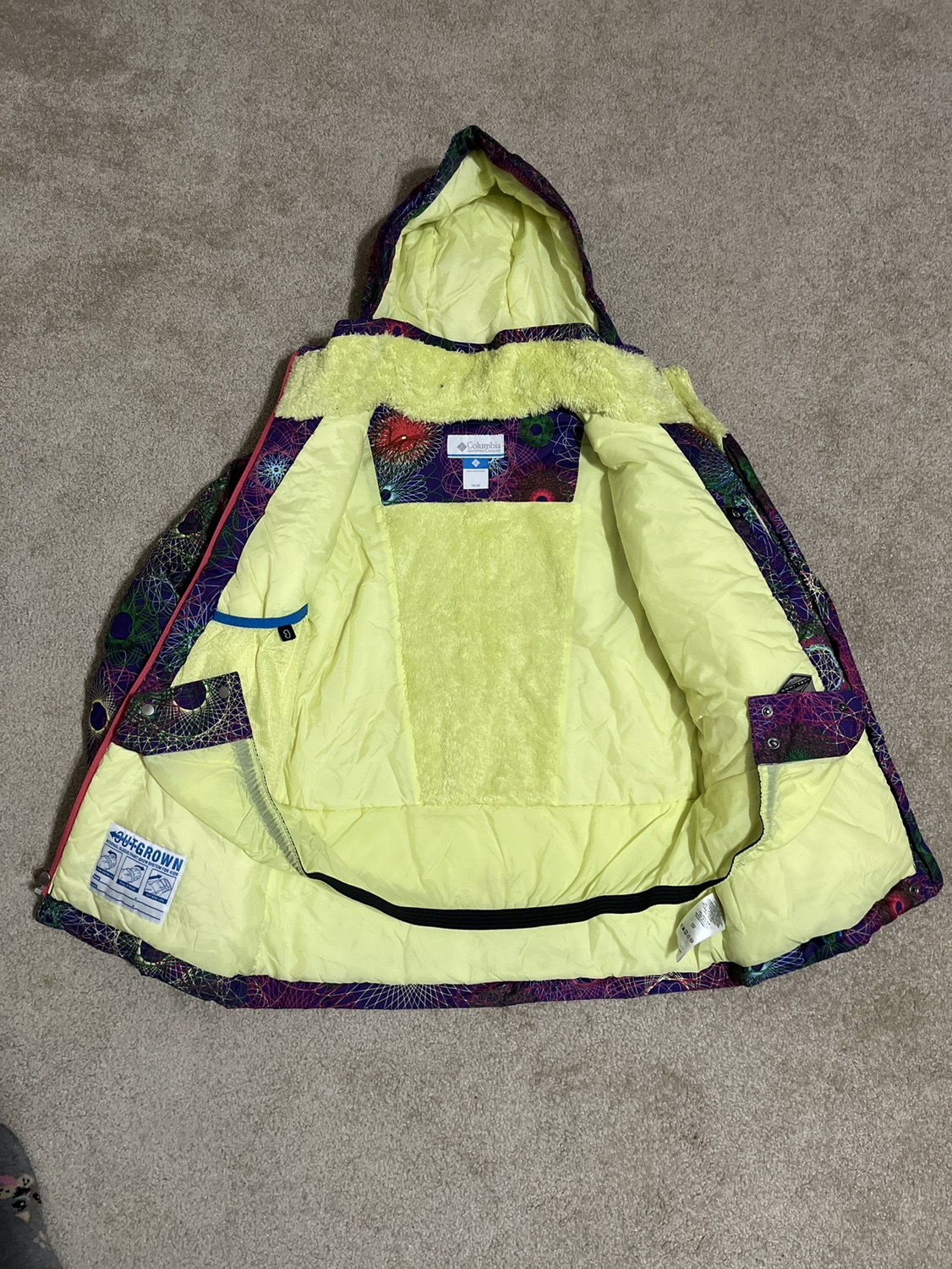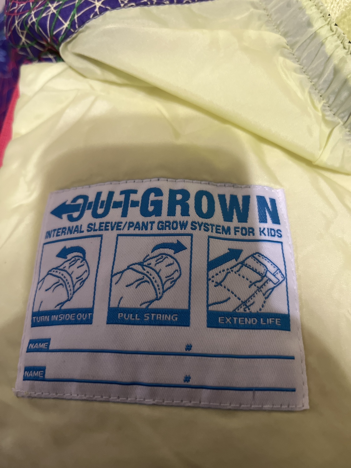 Purple and green patterned jacket with a hood. Omni-Tech waterproof and breathable fabric. Size 14/16. Has an internal sleeve/grow system. Clean and no rips or stains.