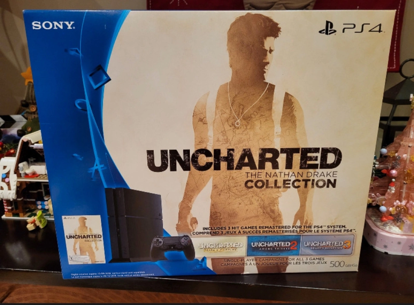 PS4 console and game. Includes Uncharted: Drake's Fortune, Uncharted 2: Among Thieves and Uncharted 3: Drake's Deception. With controller Rare edition