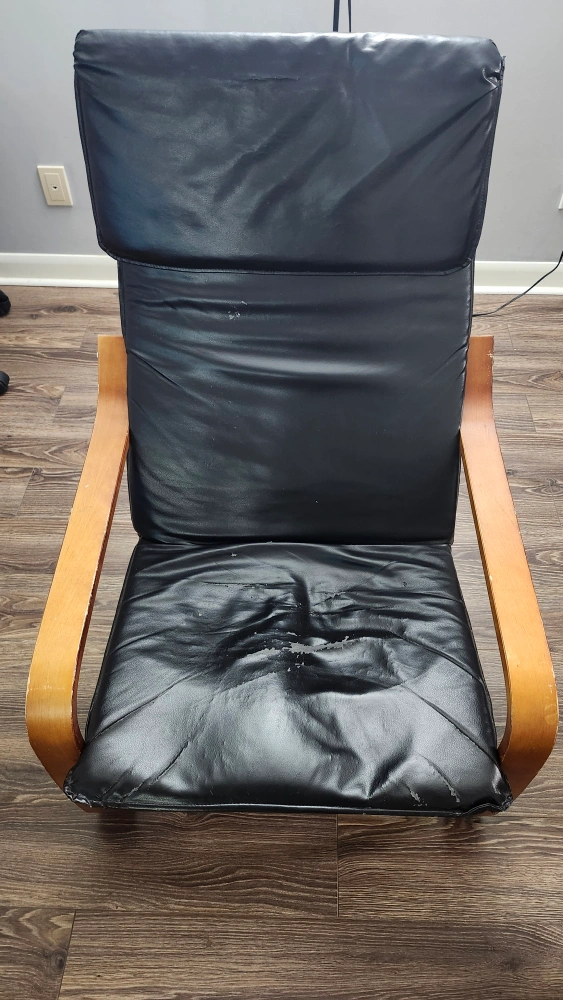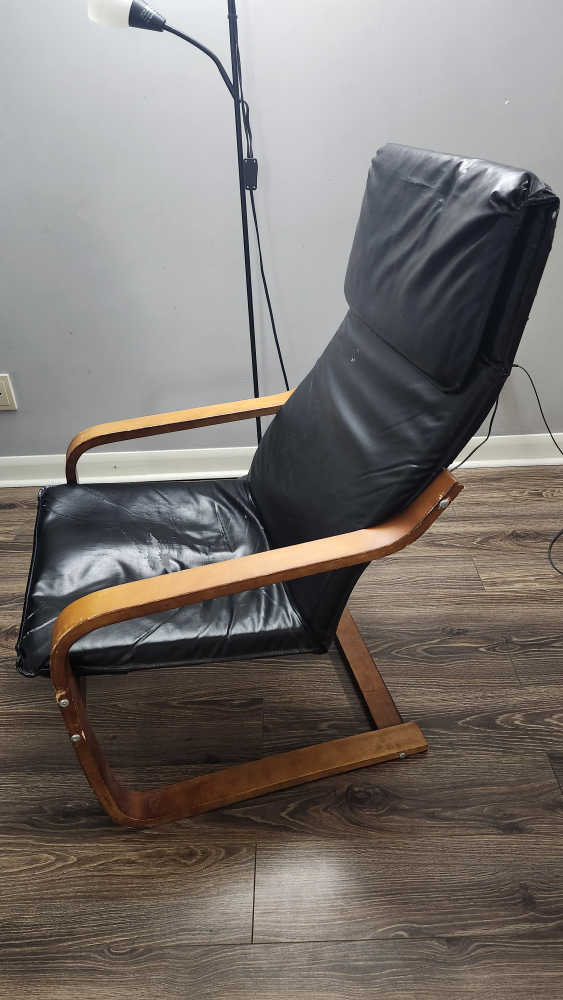 Black leather recliner chair with wooden frame. Shows signs of wear and tear.