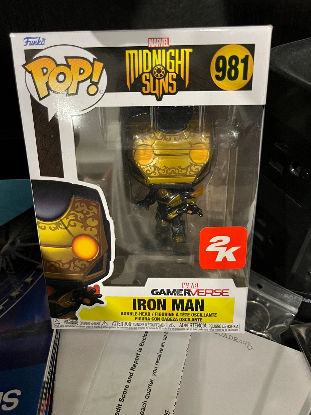 Gold and black Iron Man Pop figure from the Marvel Midnight Suns game. Comes in a box with a 2K logo. Yorkdale Mall pickup