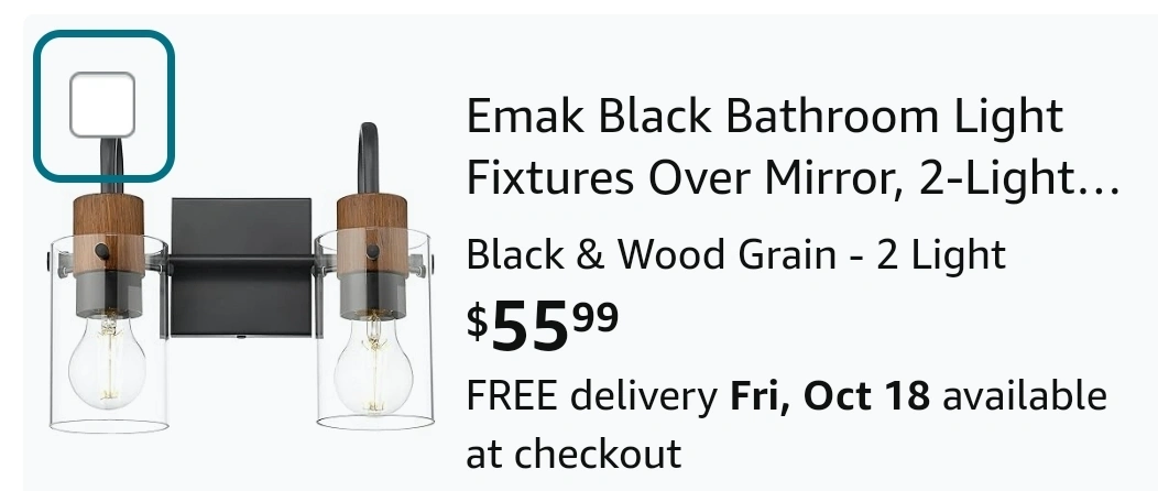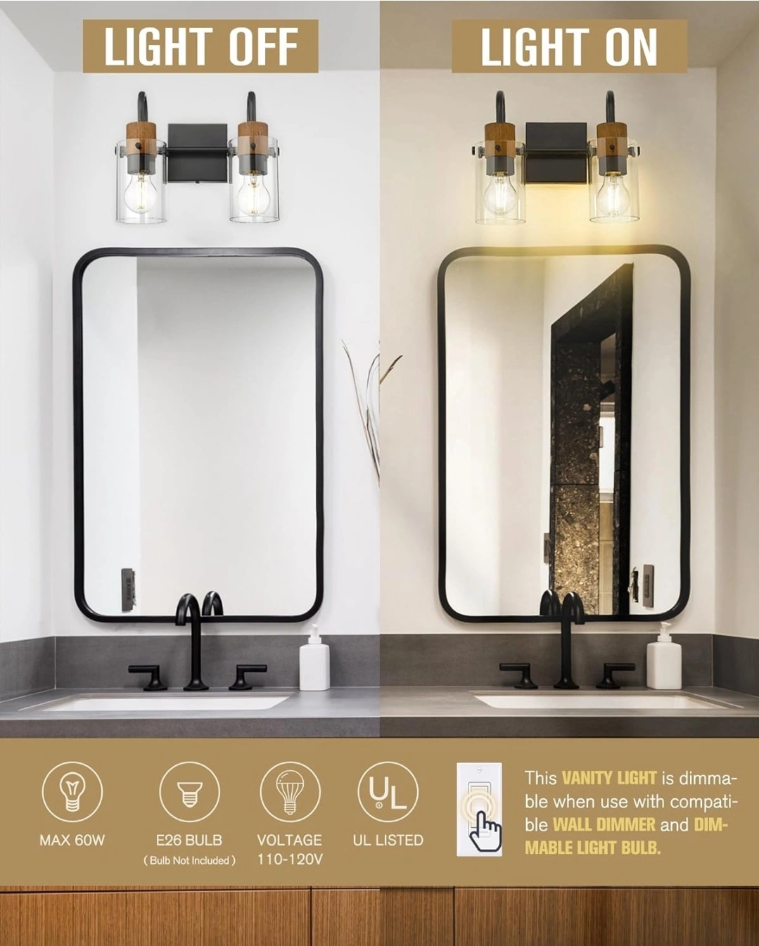 202New in box - Black & Wood Grain - 2 Light. Wall Mounted, modern design. Clear glass shade. E26 base.