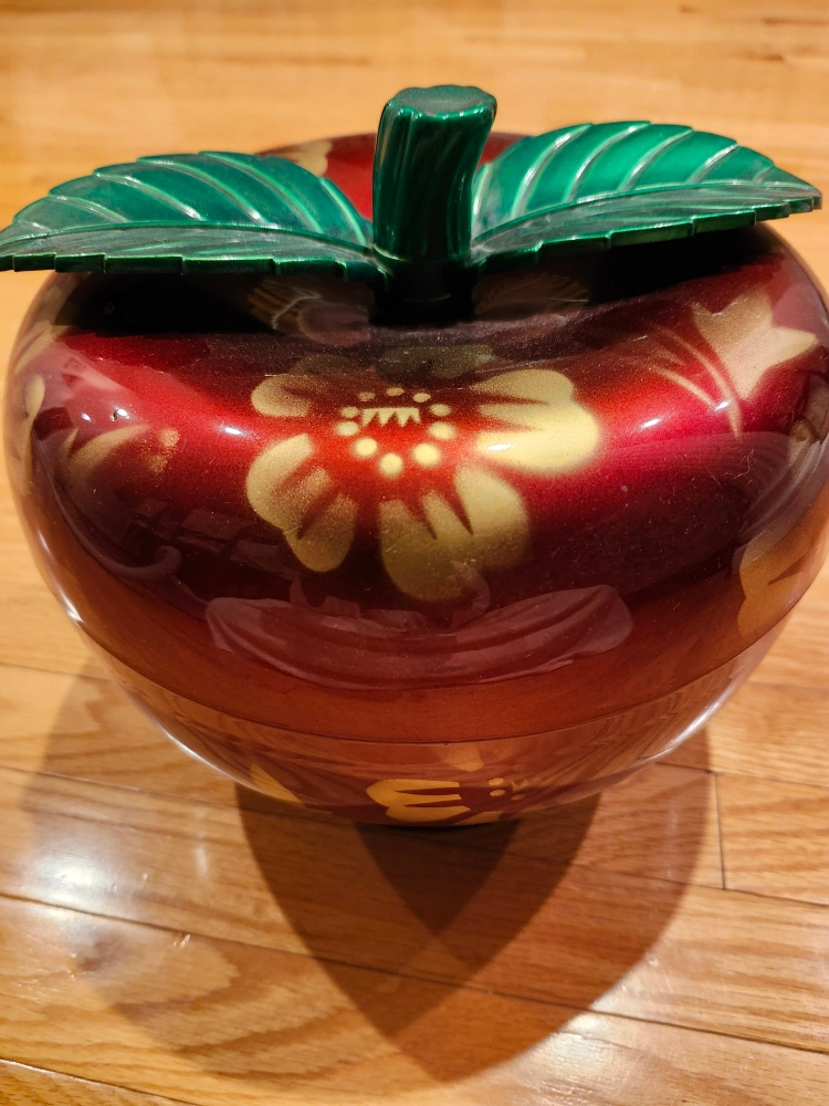 496Red apple sha ped serving dish with gold flower design. Has a lid and clear removable tray. Musical box with Fur Elise - Beethoven Can serve candies, nuts etc