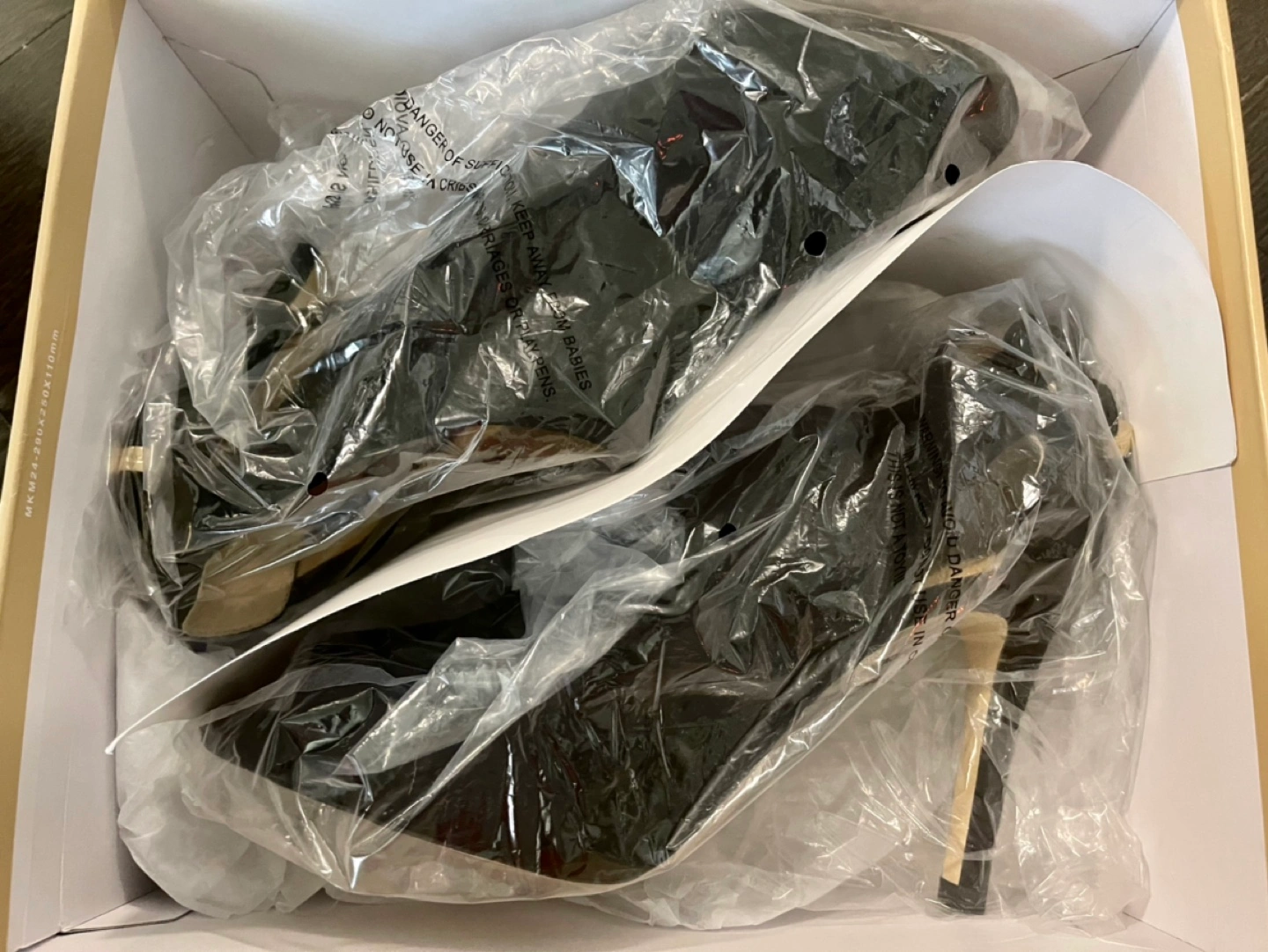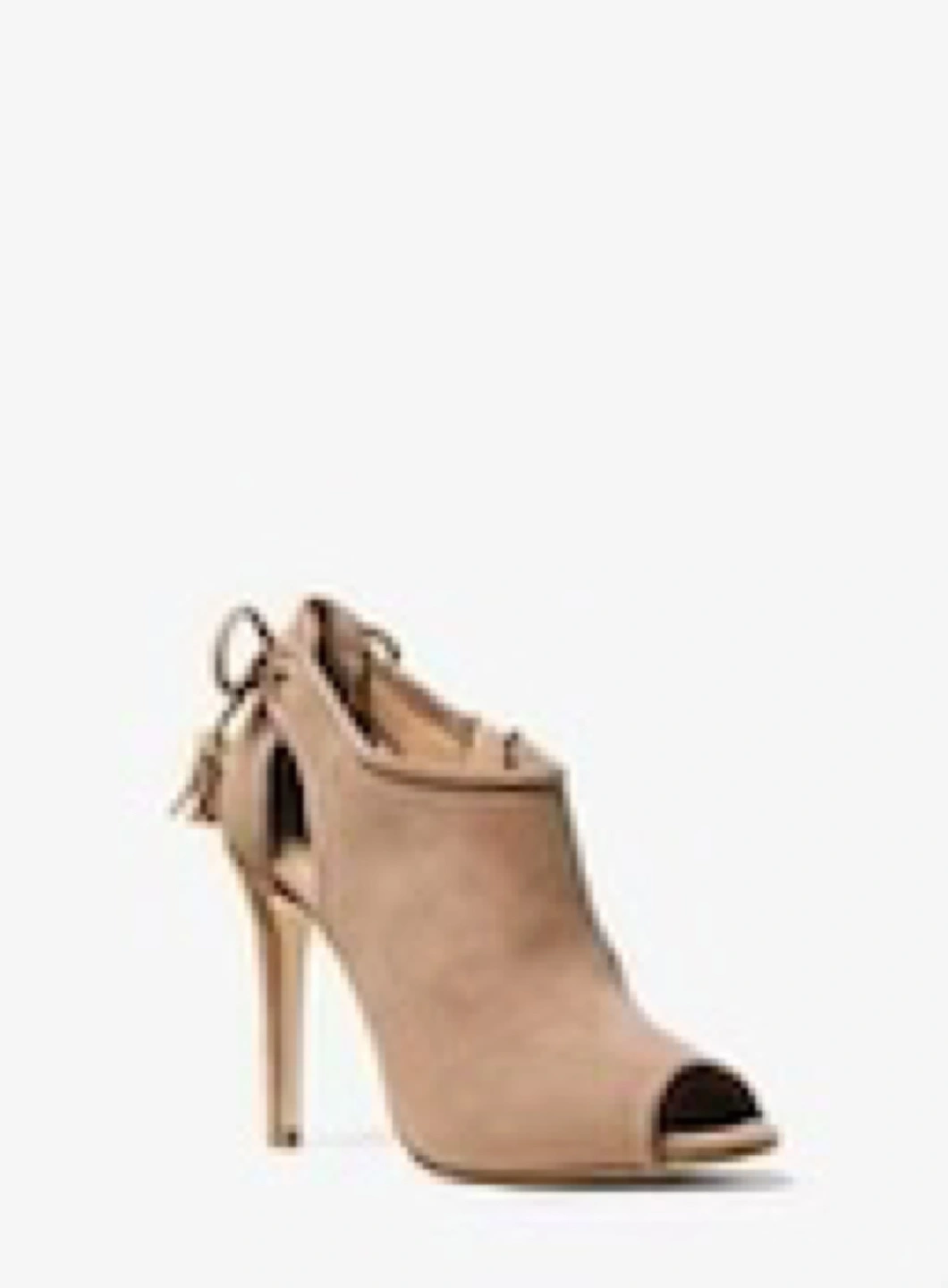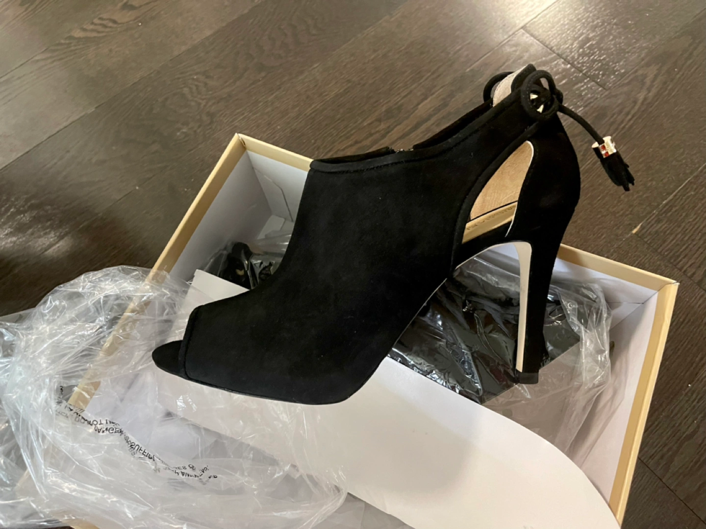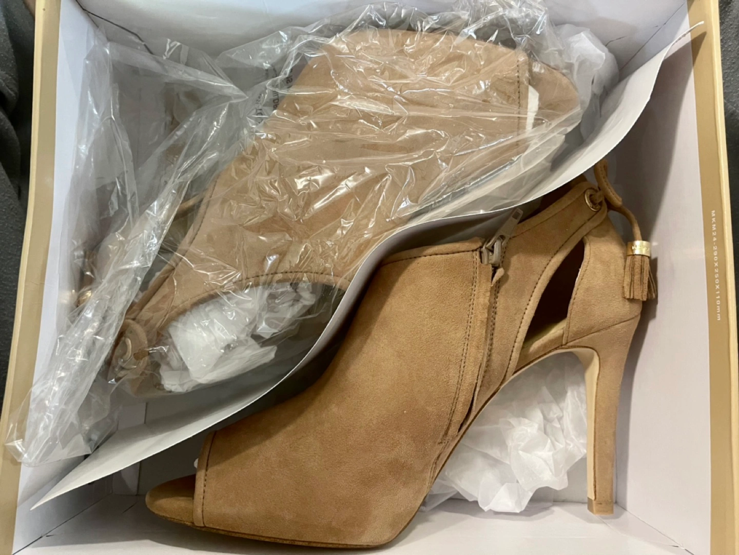 Micheal kors black and beige suede heels with open peek toe, inside zipper, gold accents and bow on the back. The heels are brand new, never been worn in original packaging. Size 10