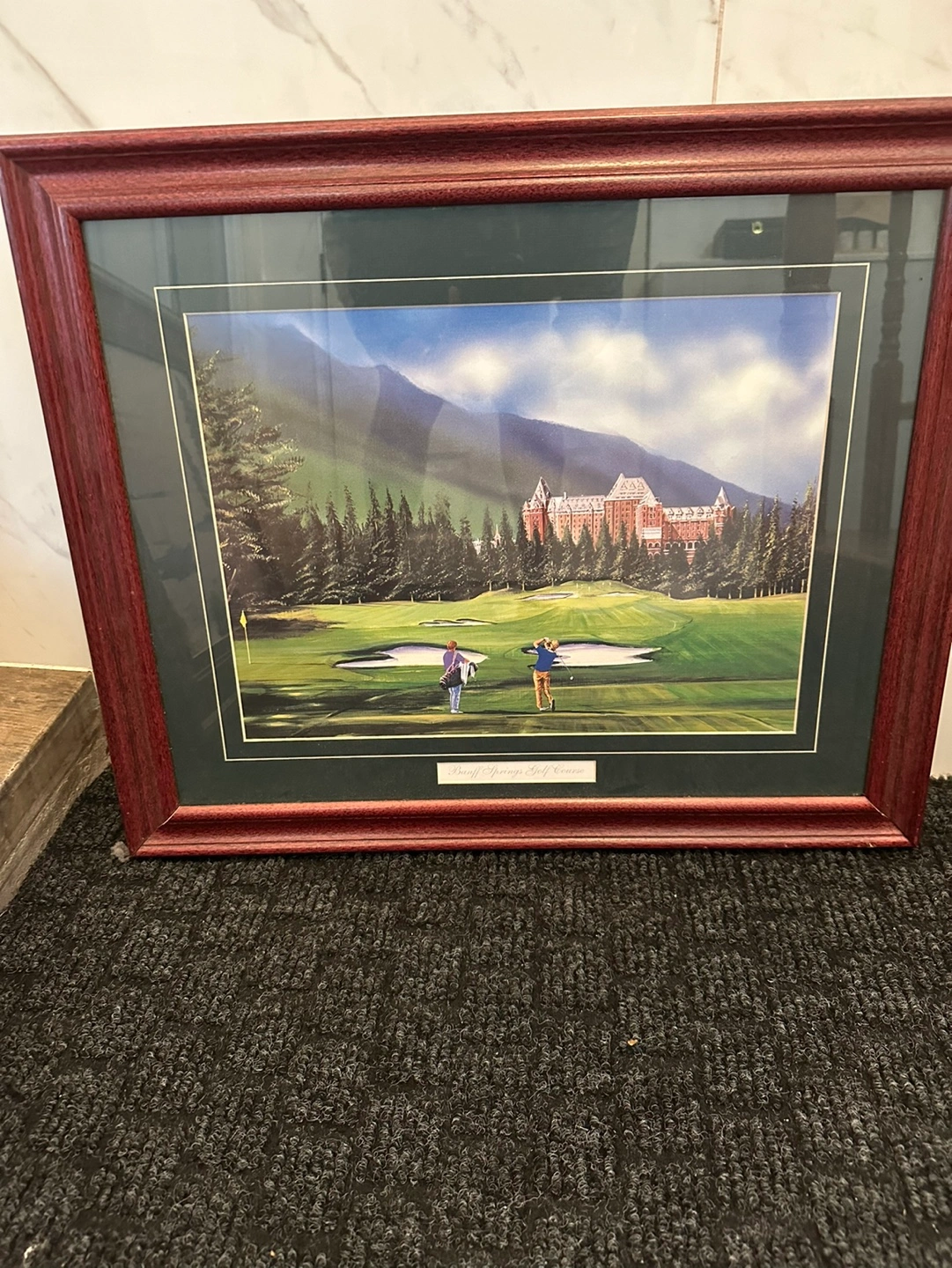 Framed print of the Banff Springs Golf Course. Features a mountain backdrop with a view of the Fairmont Banff Springs Hotel in the distance.