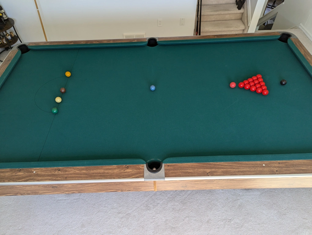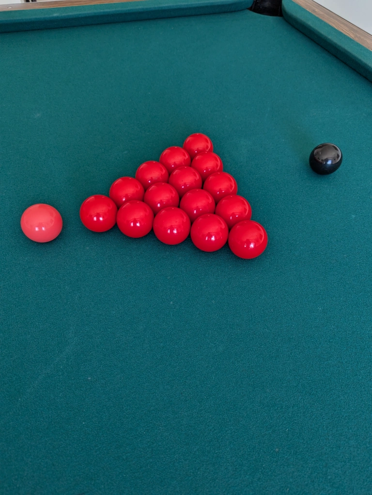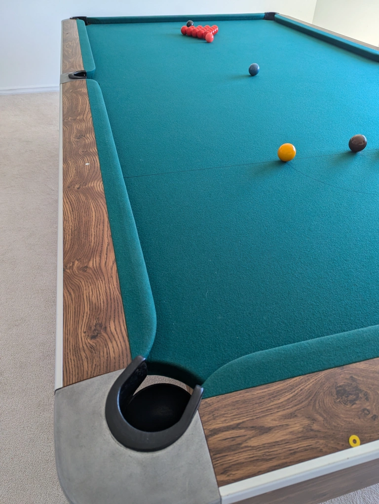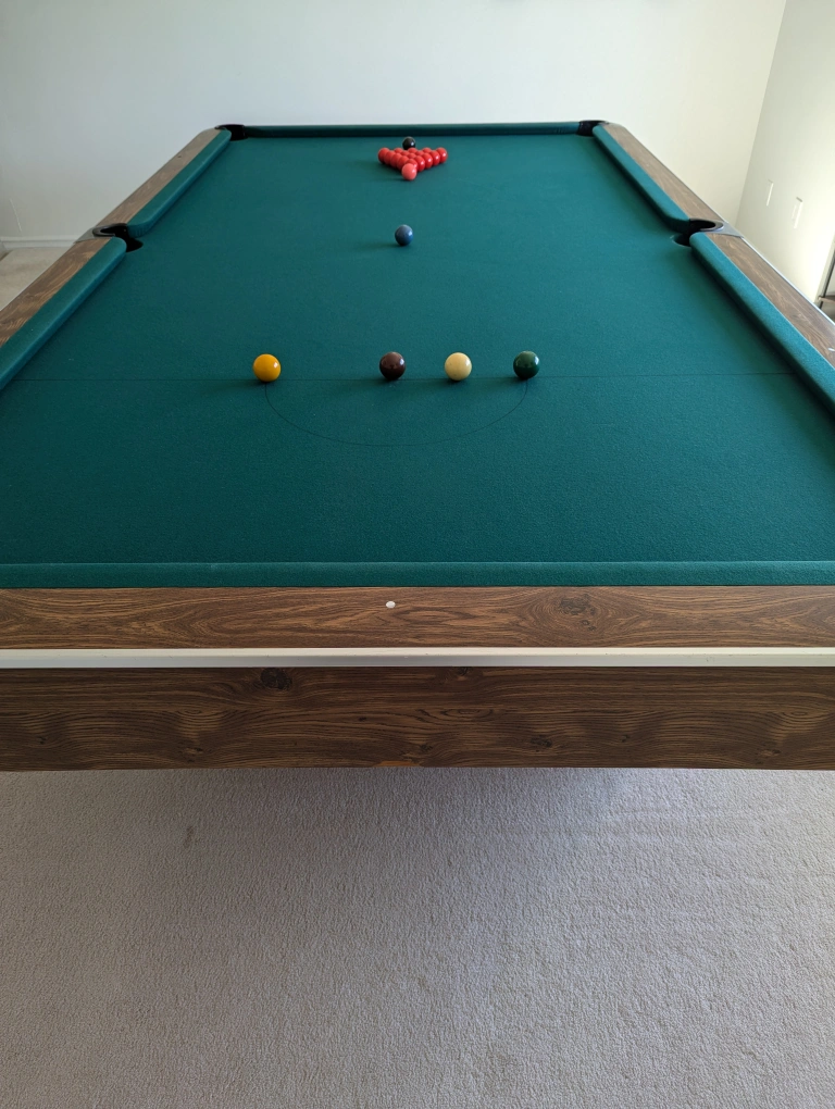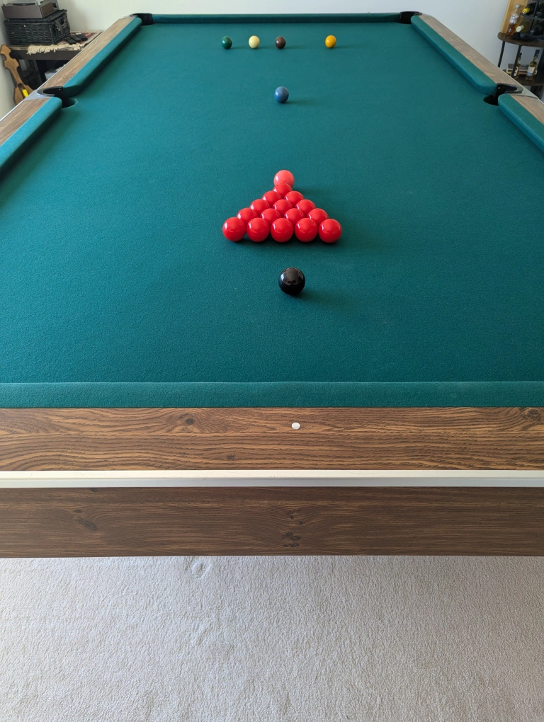 10'x5' snooker and pool table with green felt, wooden frame and black pockets. Includes all balls for both, snooker and pool.