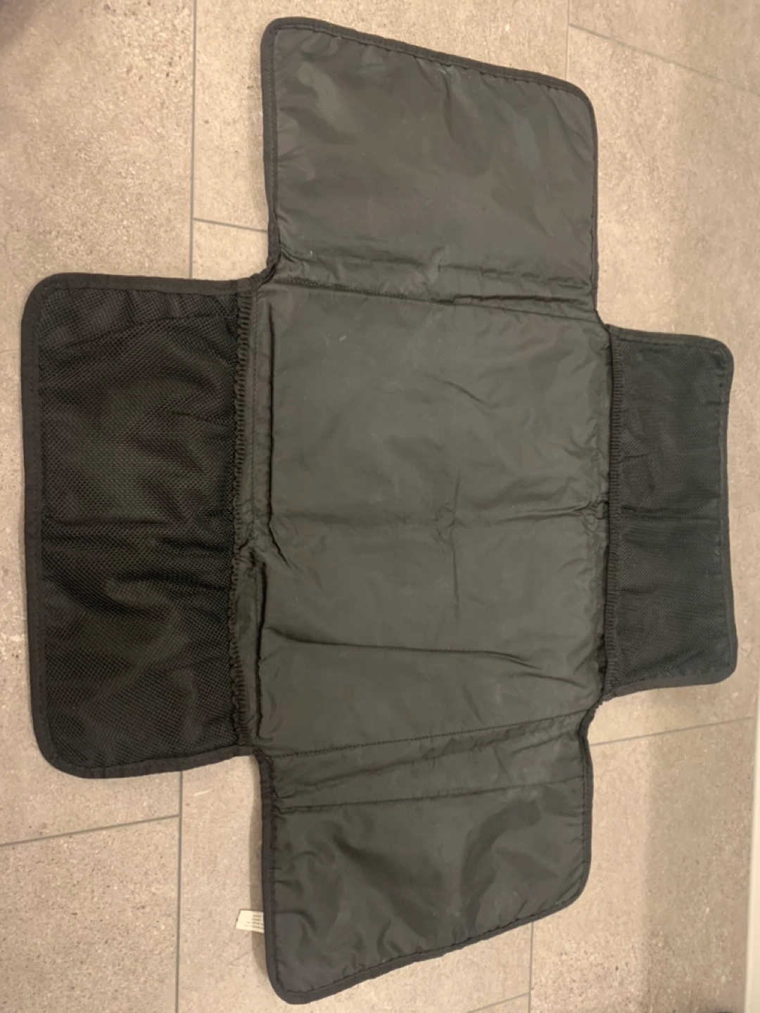 The changing mat folds easily and has small compartments to hold diapers and wipes along the sides.