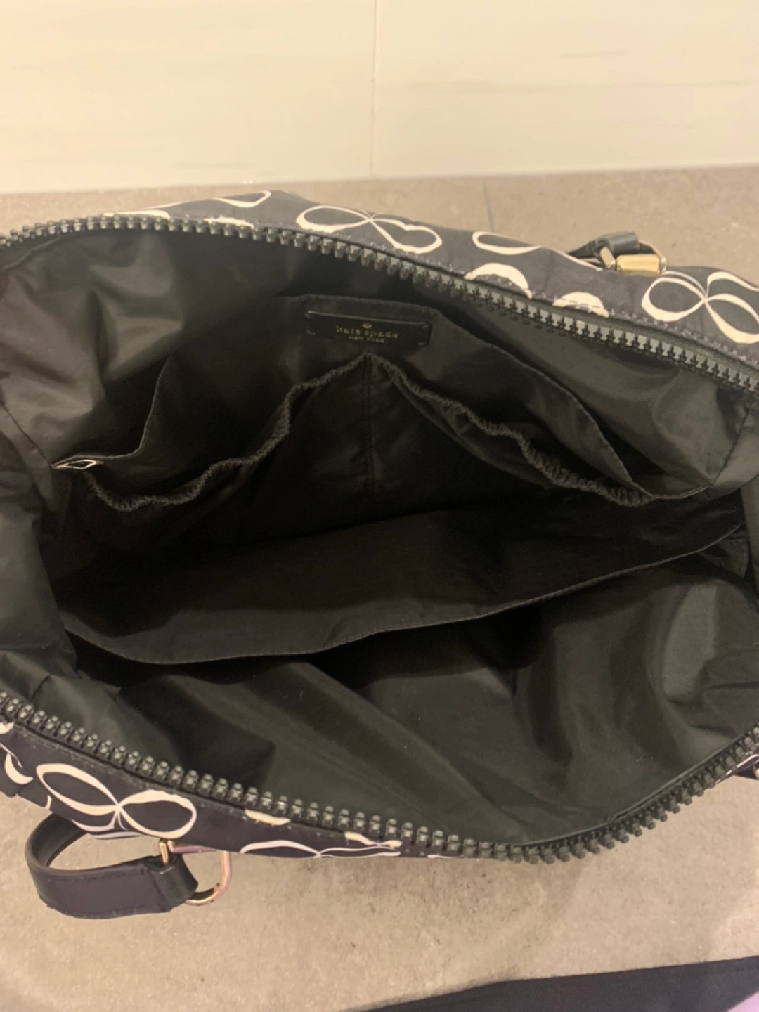 Excellent Kate Spade diaper bag with changing pad. This bag hosts multiple compartments for all of your things. There are zippers at the front and back, as well as a magnetic pocket. The inside has 5 different compartments. The outside also has two bottle pockets. Can be carried with handles or shoulder strap.