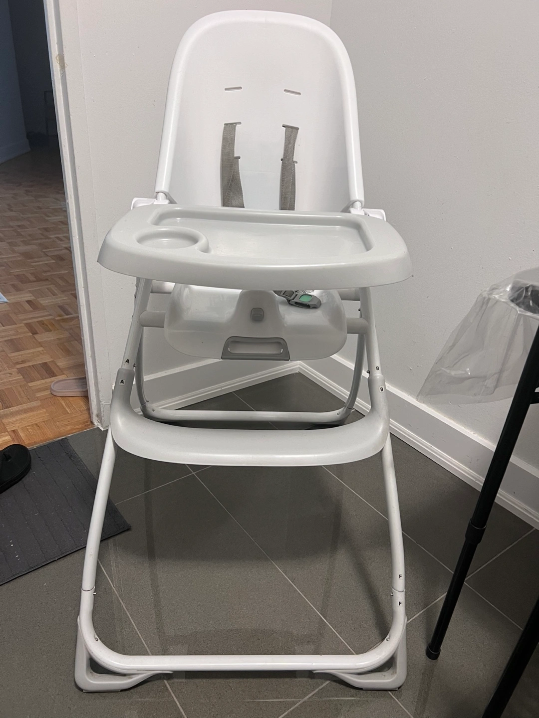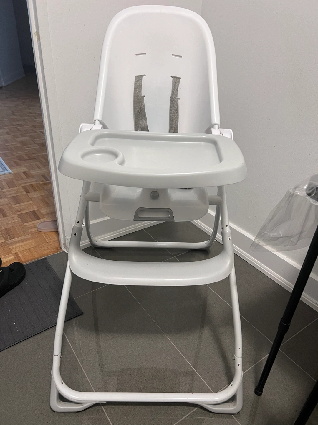 Plastic easy to clean and wipe white high chair. Includes a dishwasher safe grey food tray. Also includes a footrest and safety belts too. It folds for storage.