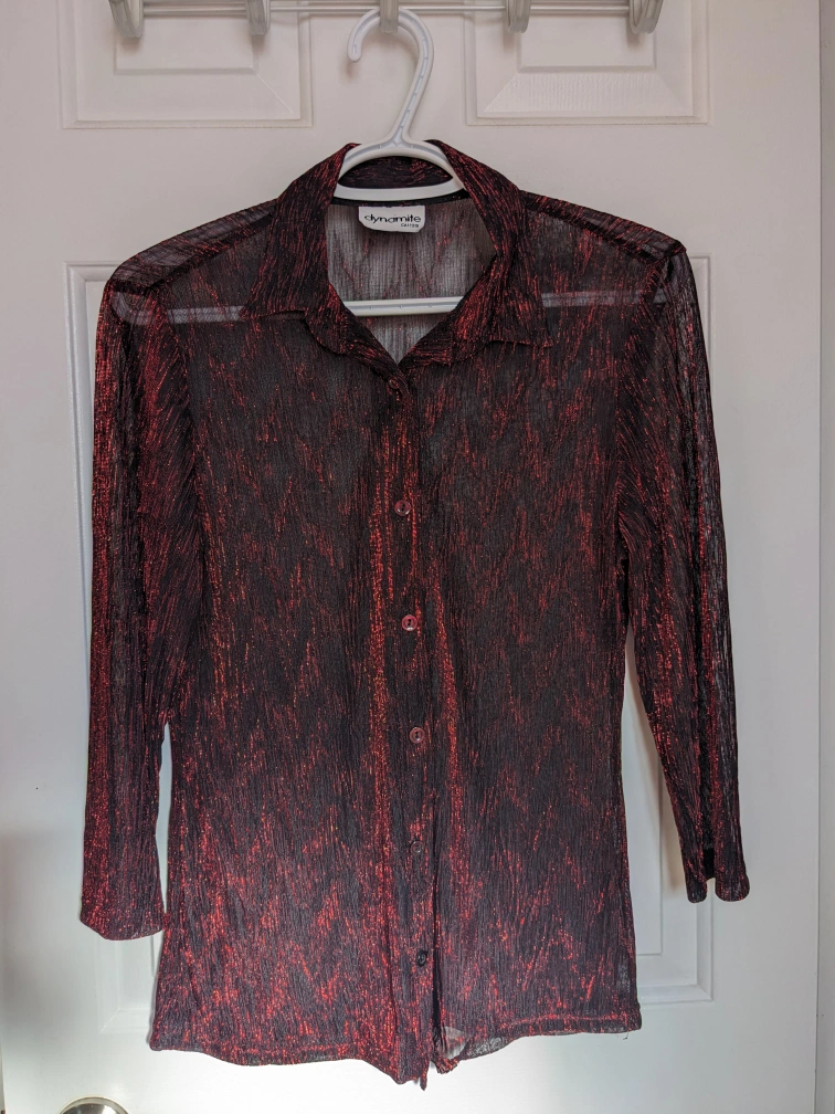 Elegant blouse, black with red glitter lurex threads, semi sheer. Looks very nice, pictures don't do it justice. Size: S/ M.