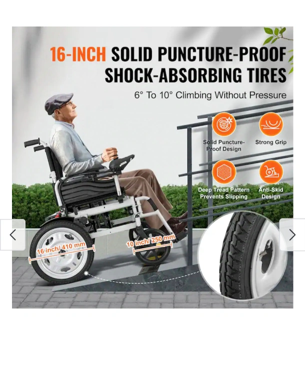 16-Inch Solid Tires: The solid, explosion-proof design ensures tire stability and durability. Whether climbing a 6° or 10° slope, the deep tread pattern increases grip, effectively preventing slipping and sliding. The front wheel diameter is 10 inches, and the rear wheel diameter is 16 inches.