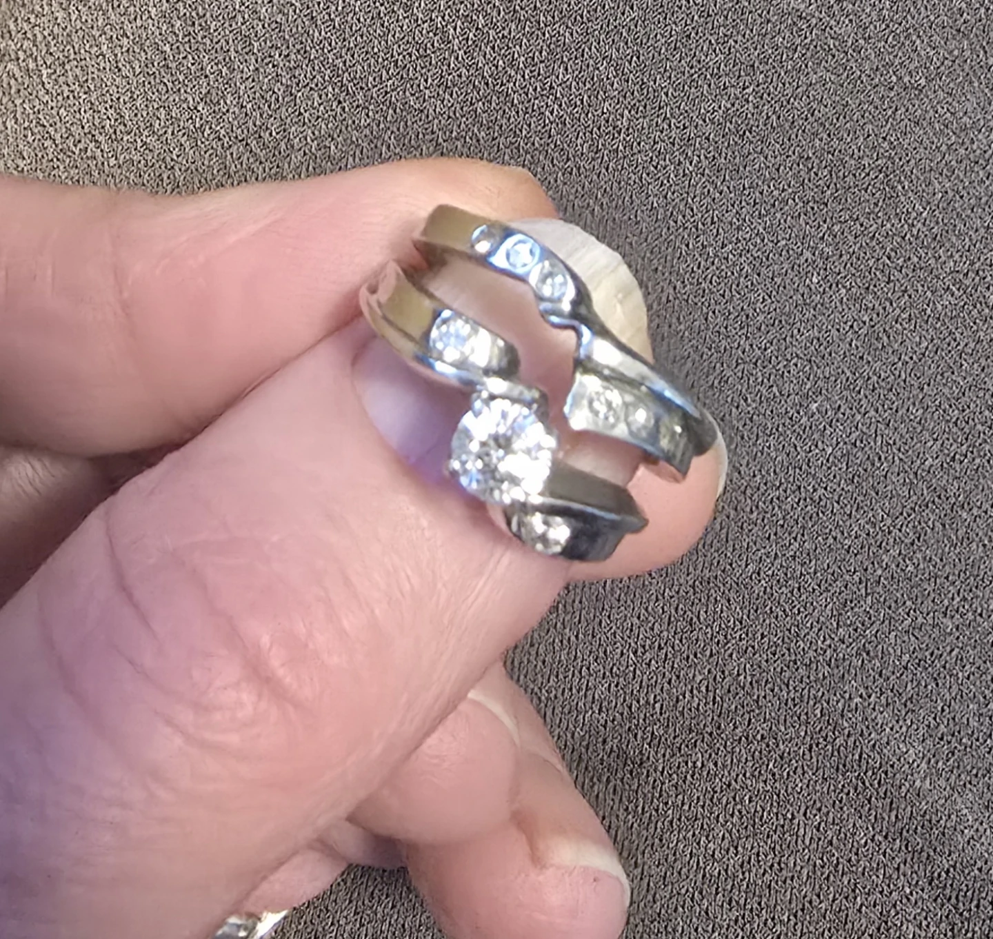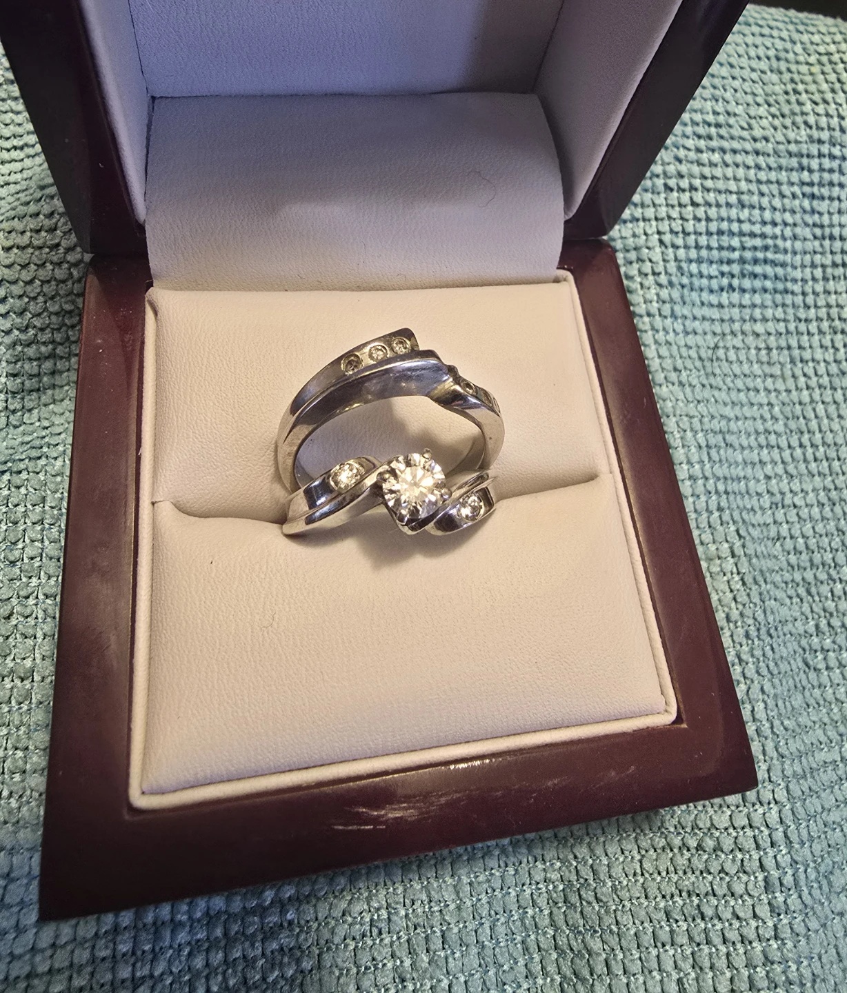 Two-piece ring set, featuring a central diamond solitaire ring and two matching bands. The bands have small diamonds around the edge. This is a custom made set. Appraised at over 7,000.00