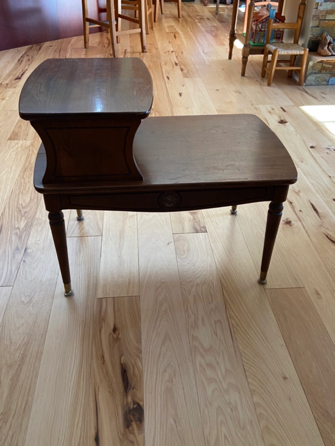 Buy & SellVintage Mid-Century Modern Telephone TableVintage Mid-Century Modern Telephone Table$20Wood end table with brass feet and a smaller surface for a phone. Okay as is or a nice project pieceDimensions18”x28”x15/23”WHERE TO MEETView RoyalView MapSELLERverifiedAndy DView Royal761 review0 chats·4 favorites·141 viewsSEND CHAT TO SELLERHi Andy D! I’m interested in your listing.Hi Andy D! I’m interested in your listing.Get the Karrot app to chatSign In to chat