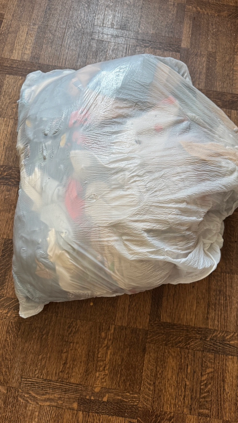 Medium size garbage bag full of baby clothing. Mostly t-shirts,pants, night suits , Onesie and bibs All are new . Some are new