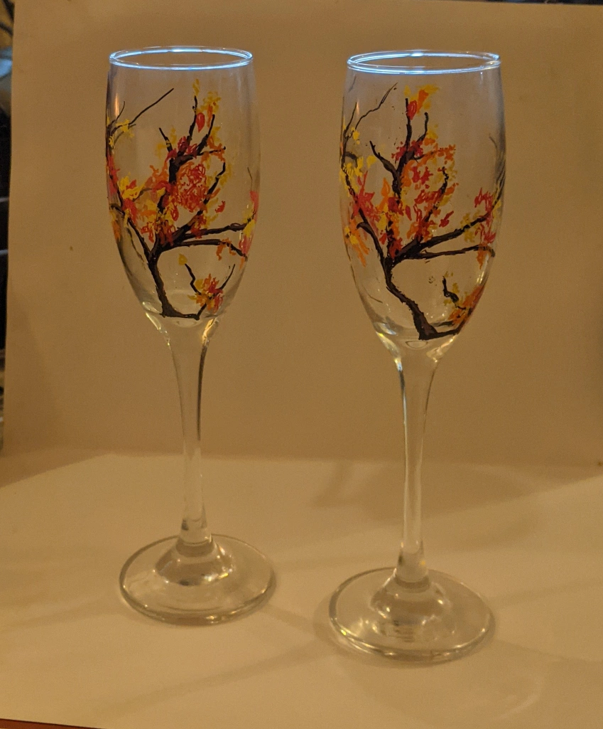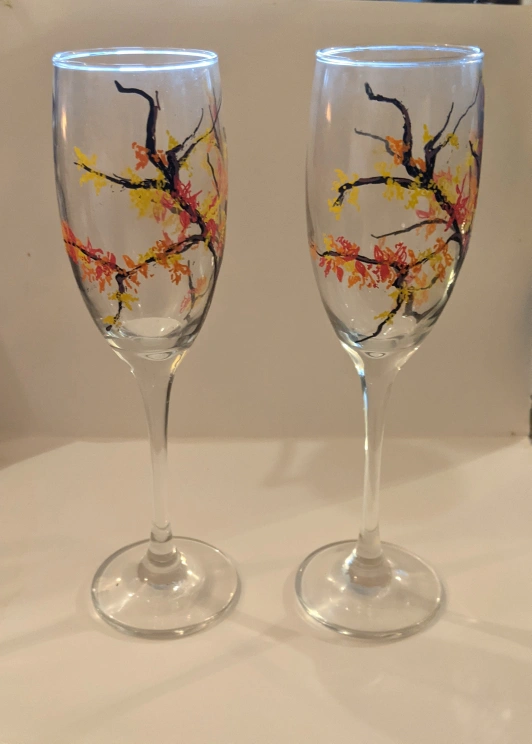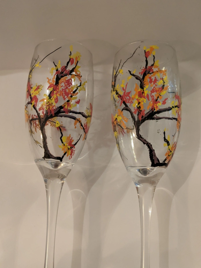 Set of two champagne flutes. Hand-painted with autumn-themed design. Tall and elegant.