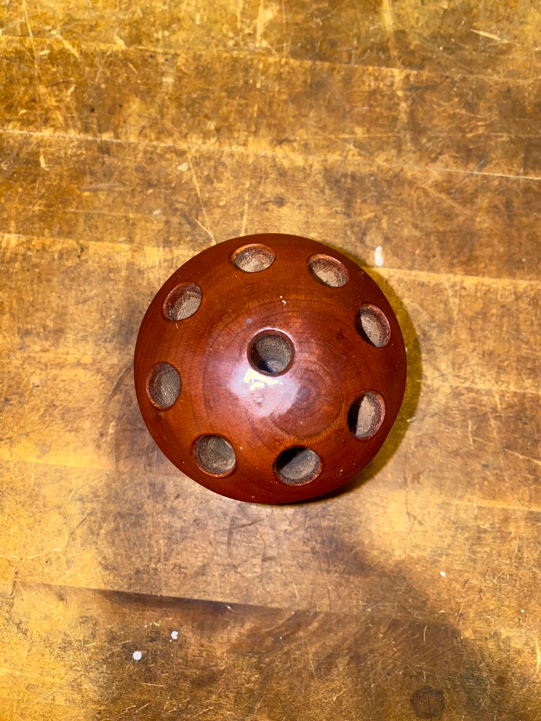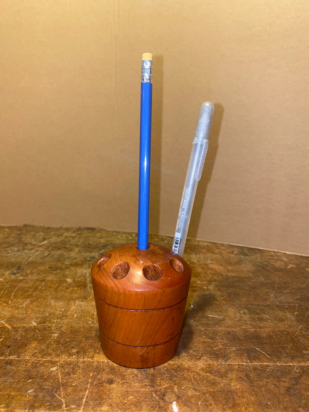 Small wooden pen and pencil holder. Holds pens, pencils, and other small items. Great for a desk or office.