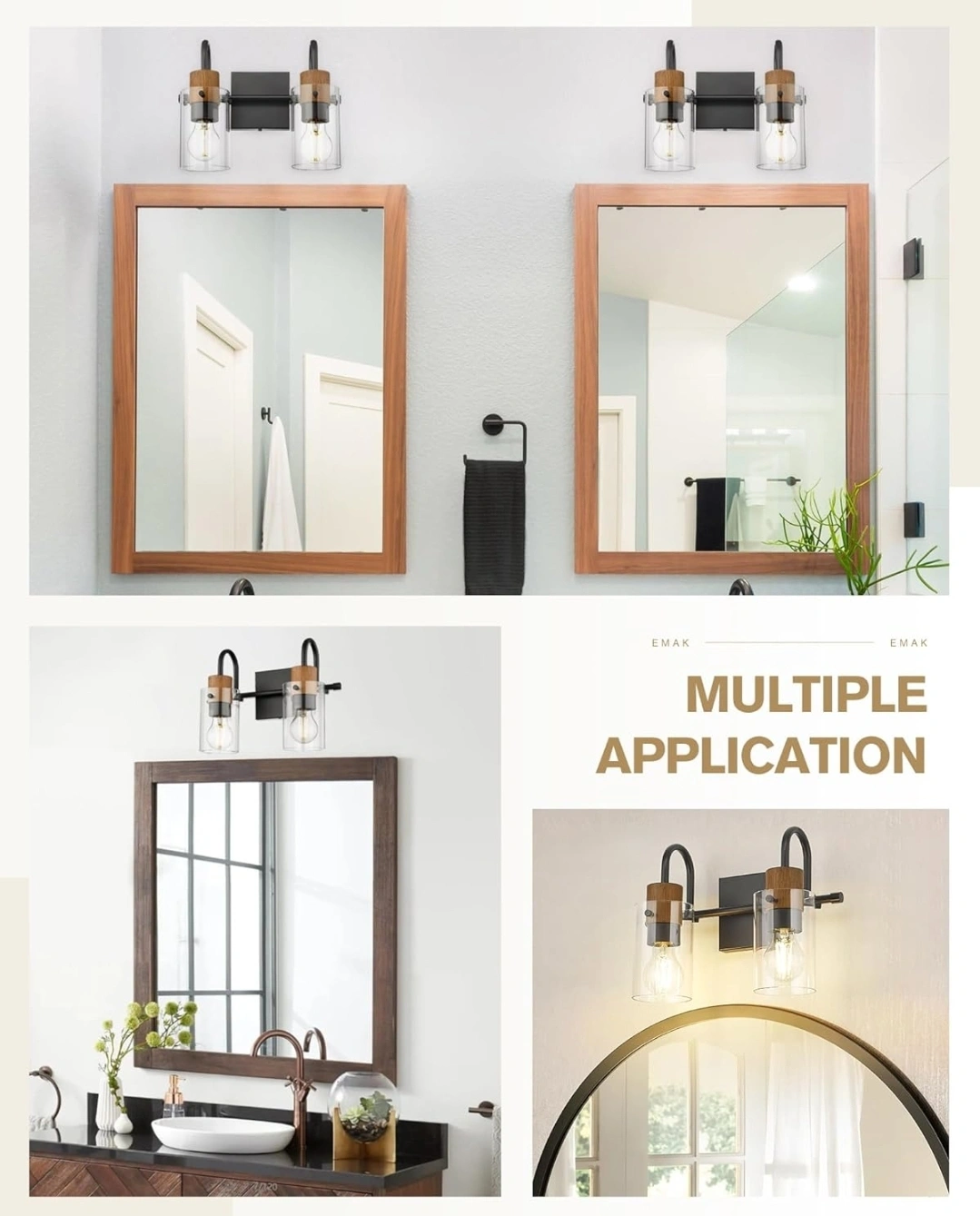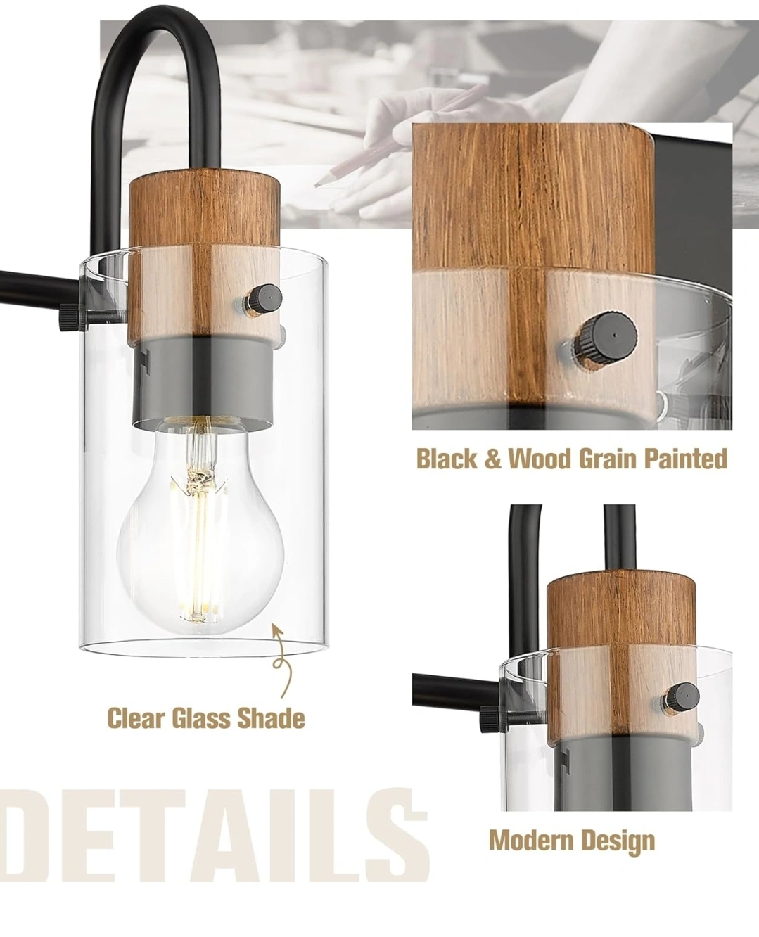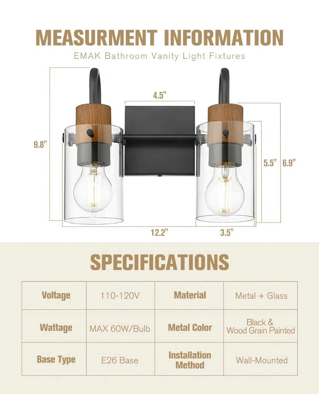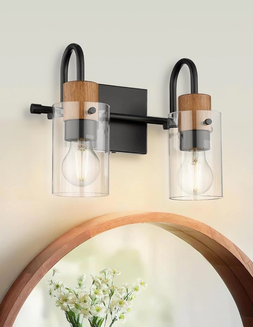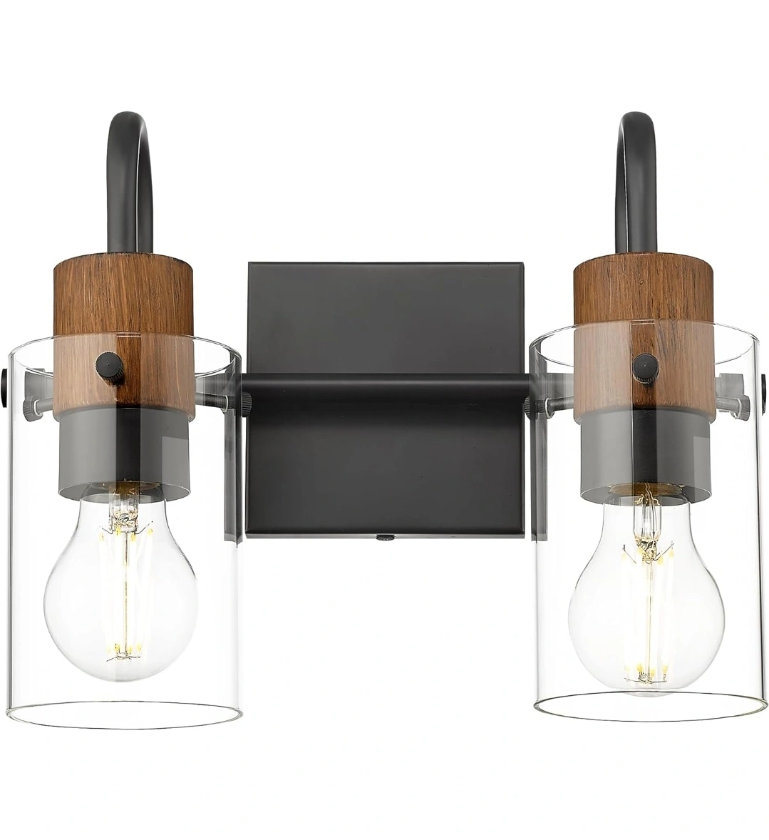 202Black & Wood Grain - 2 Light, Clear Glass Shade, Modern Design, Wall-Mounted