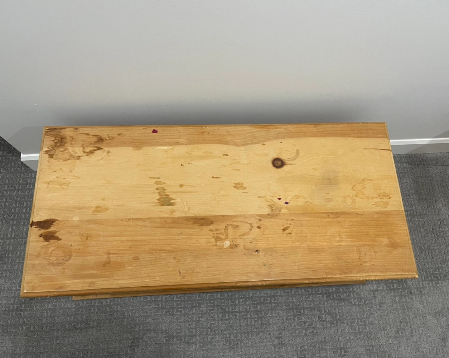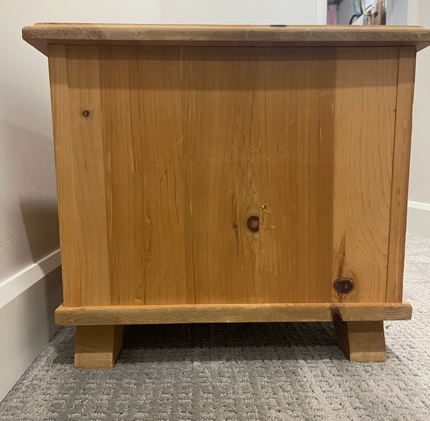 Wooden chest with hinges and a lid. Solid pine wood construction. Some minor wear and tear.