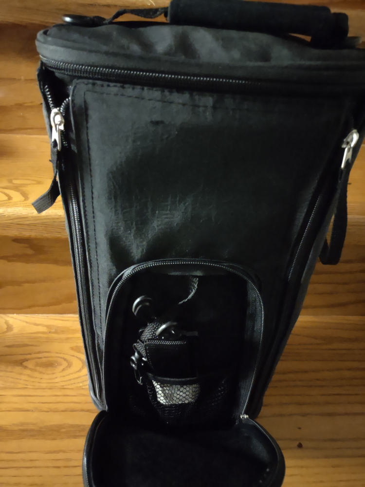Black insulated bottle bag. Has two compartments and a carrying handle. Insulated to keep bottles cool. wine travel carrying case
