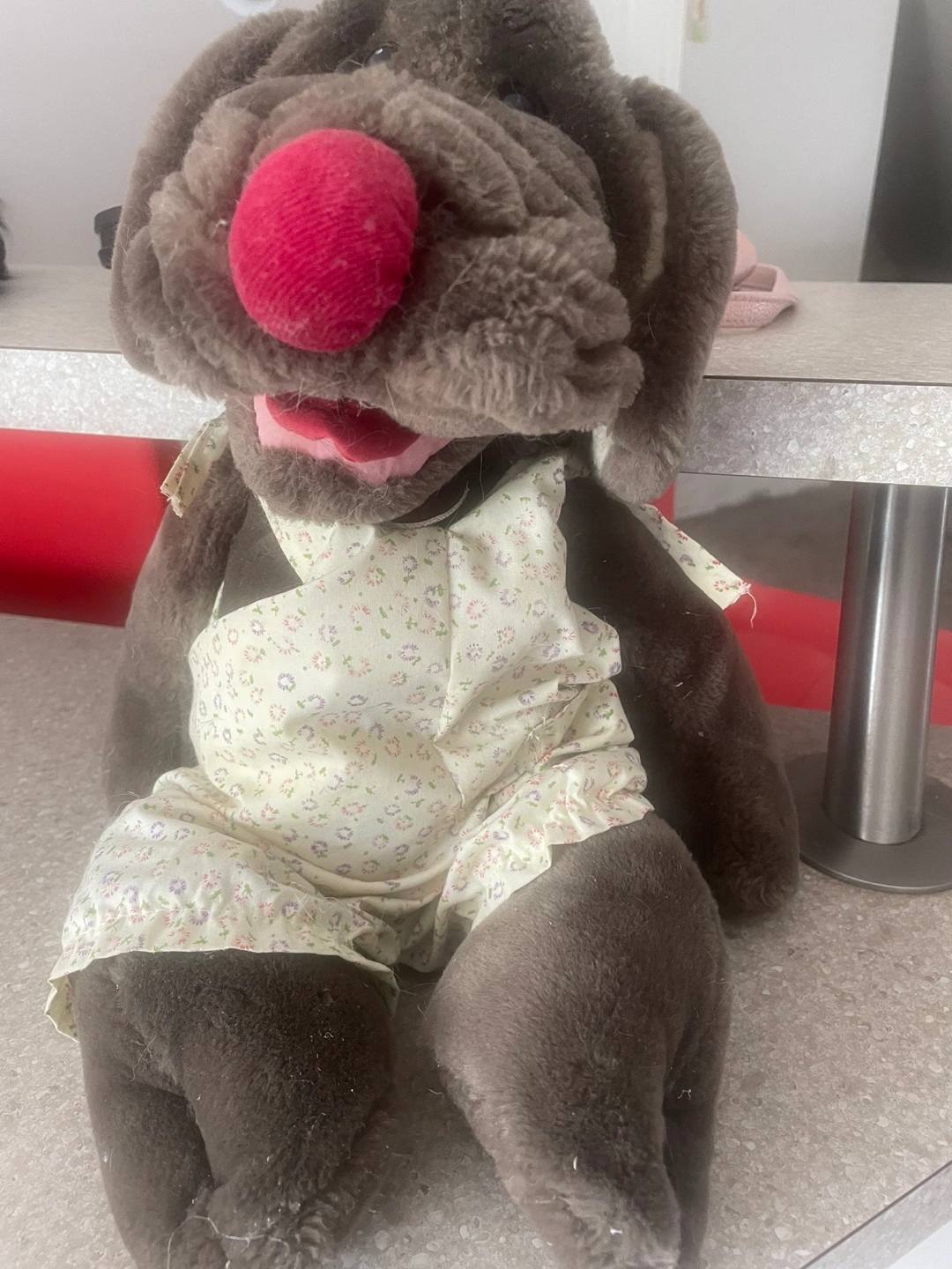 Collectable Brown plush dog hand puppet wearing a floral apron. Red nose. Pick up is Sherwood park or can maybe meet nearby.