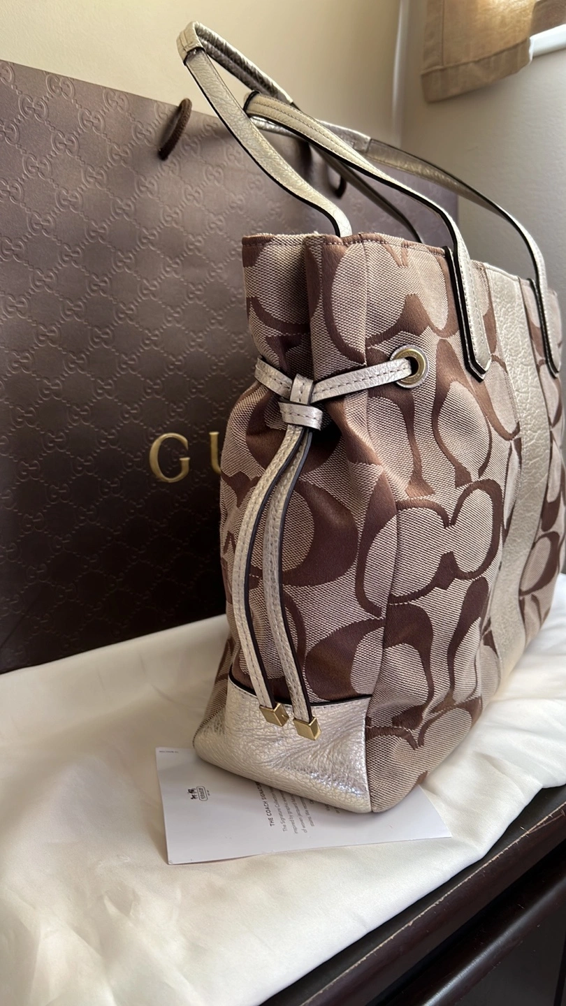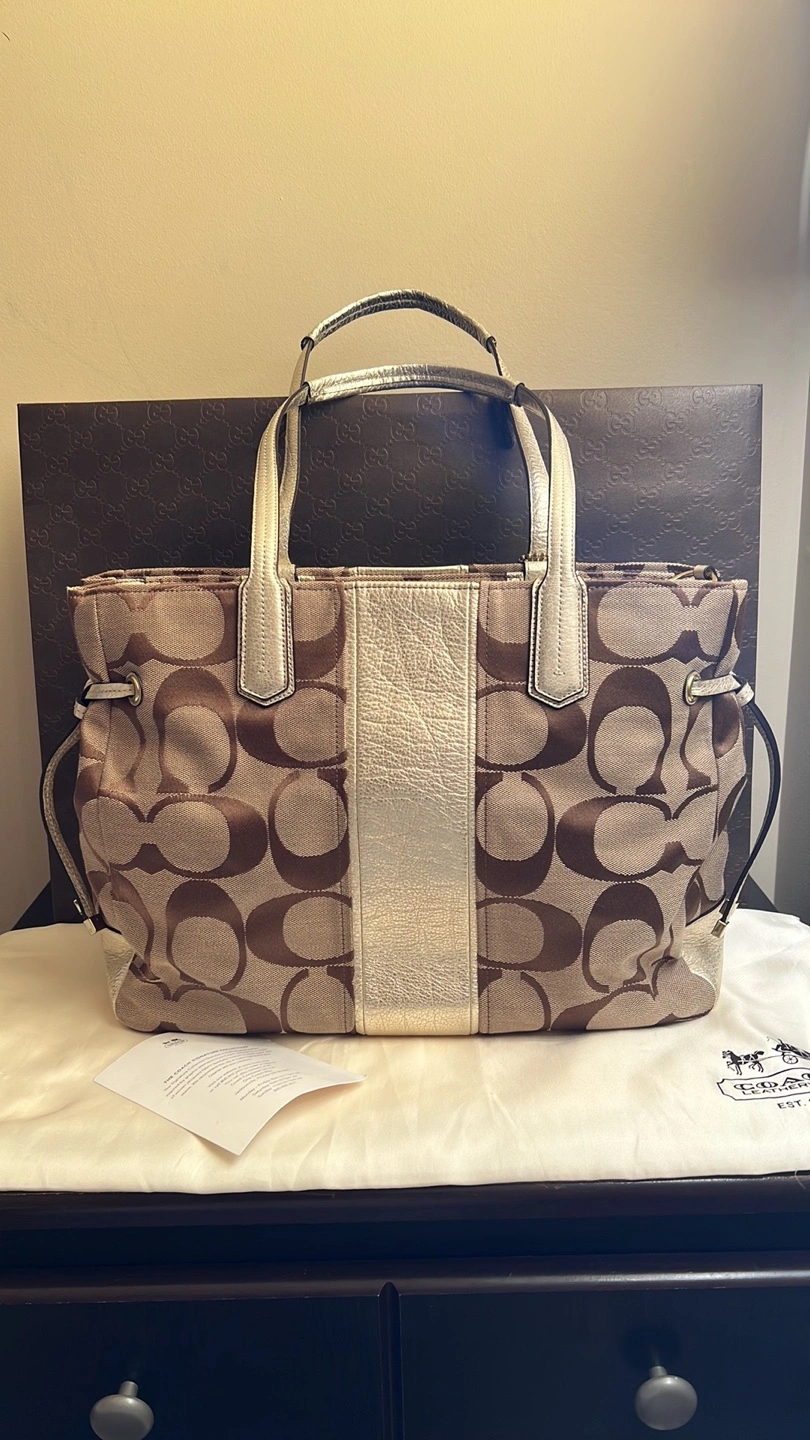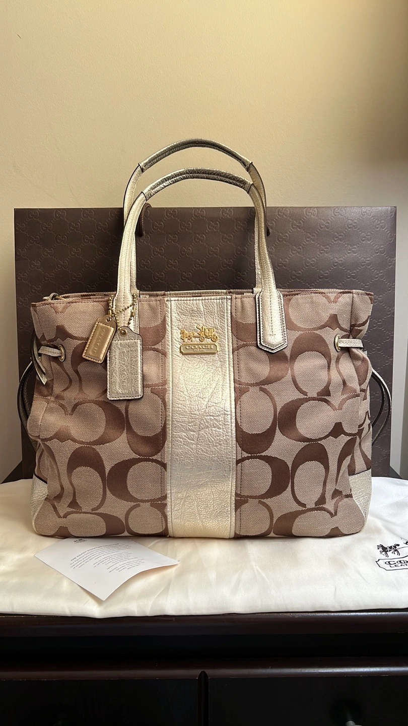 Large tote bag with a brown and beige signature Coach pattern. Gold-toned hardware. Has a zipper closure. Comes with a dust bag and care card. No longer comes with original box.
