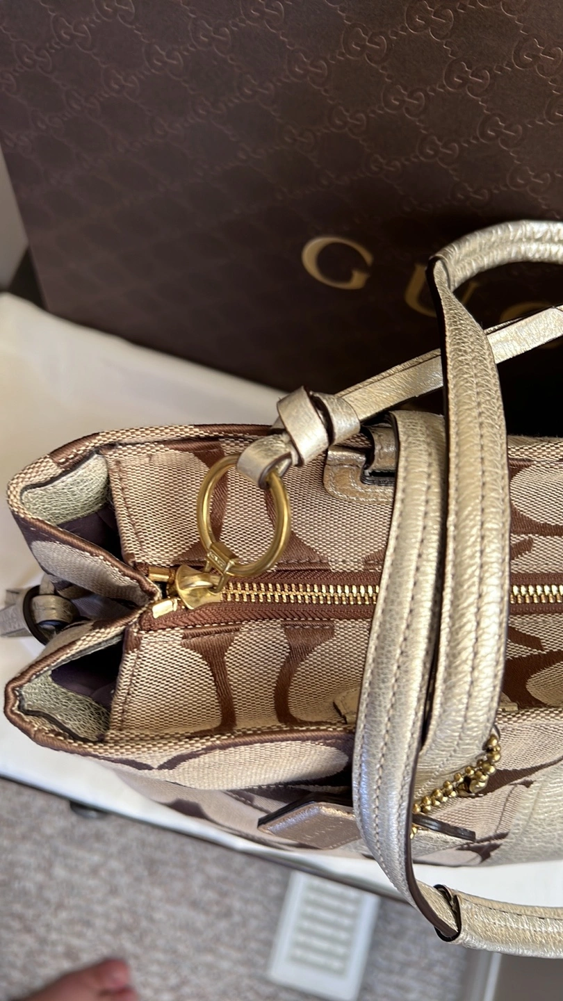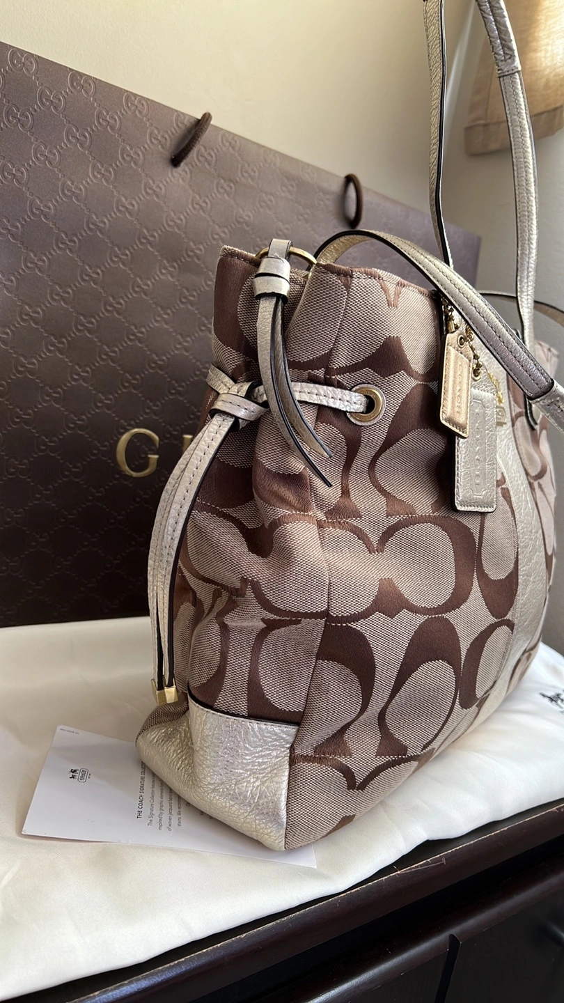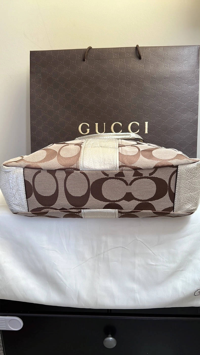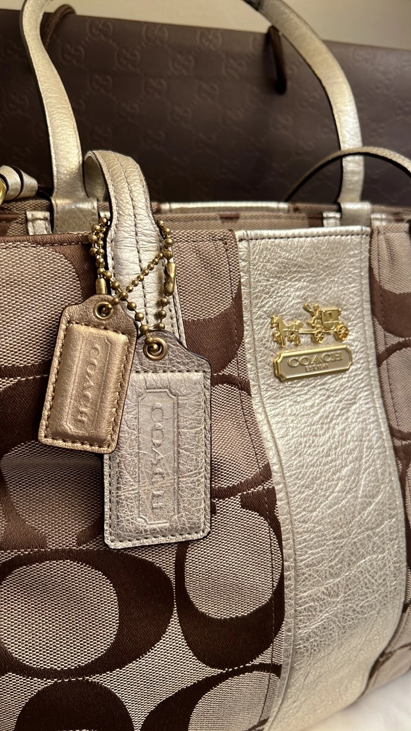 Large tote bag with a brown and beige signature Coach pattern. Gold-toned hardware. Has a zipper closure. Comes with a dust bag and care card. No longer comes with original box.