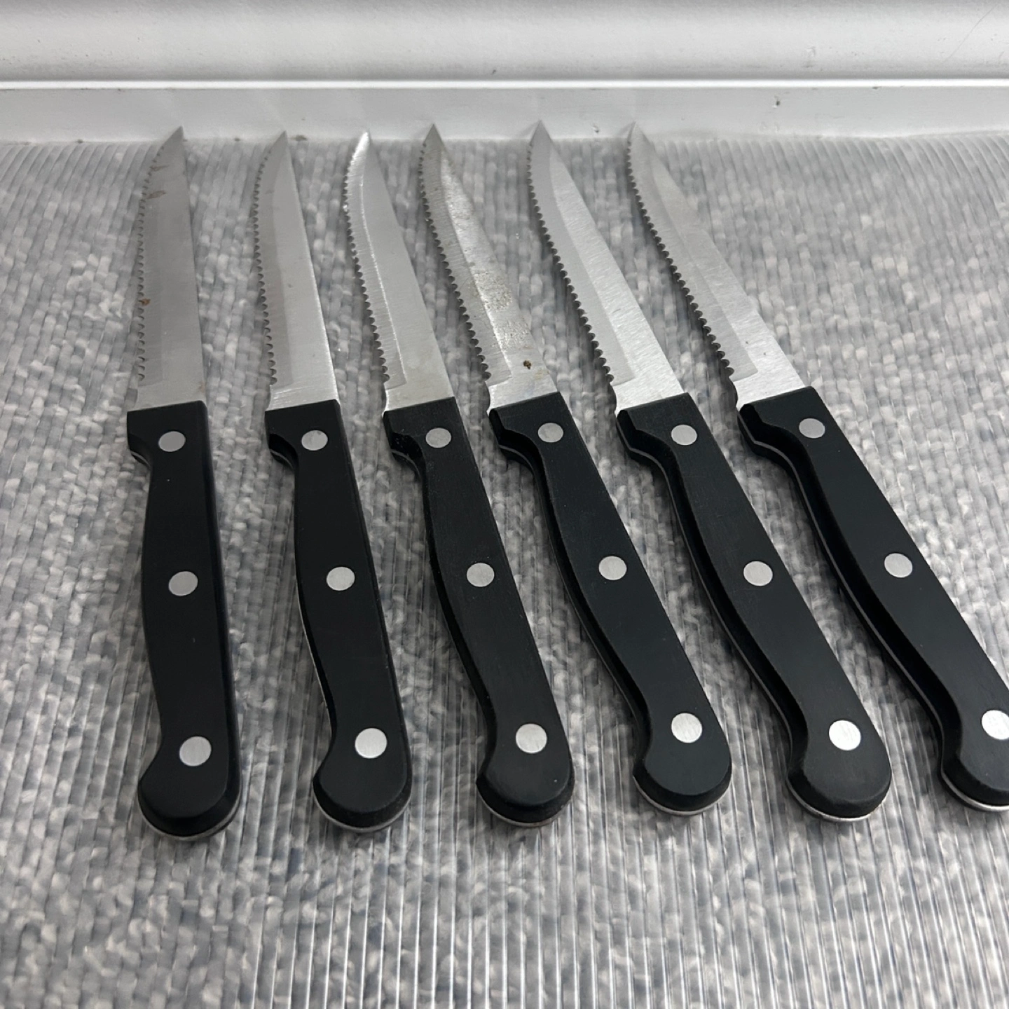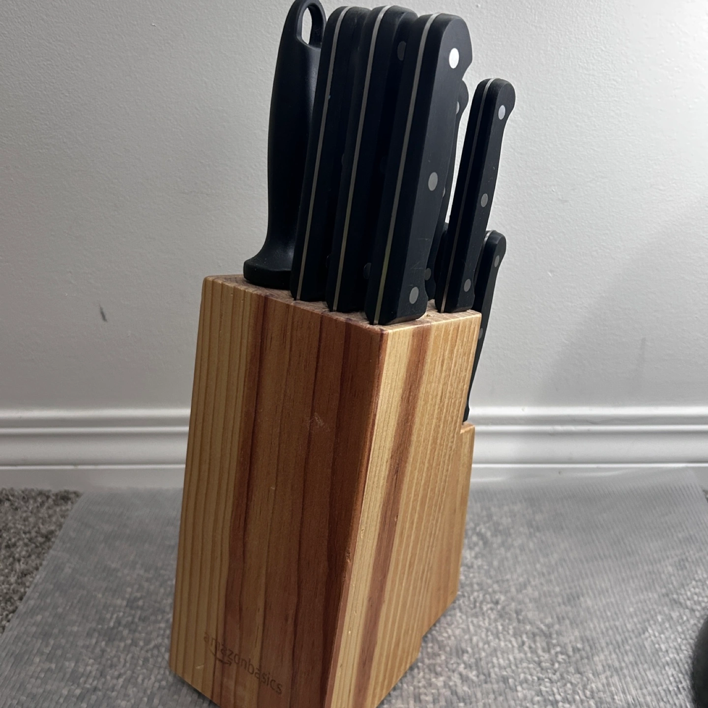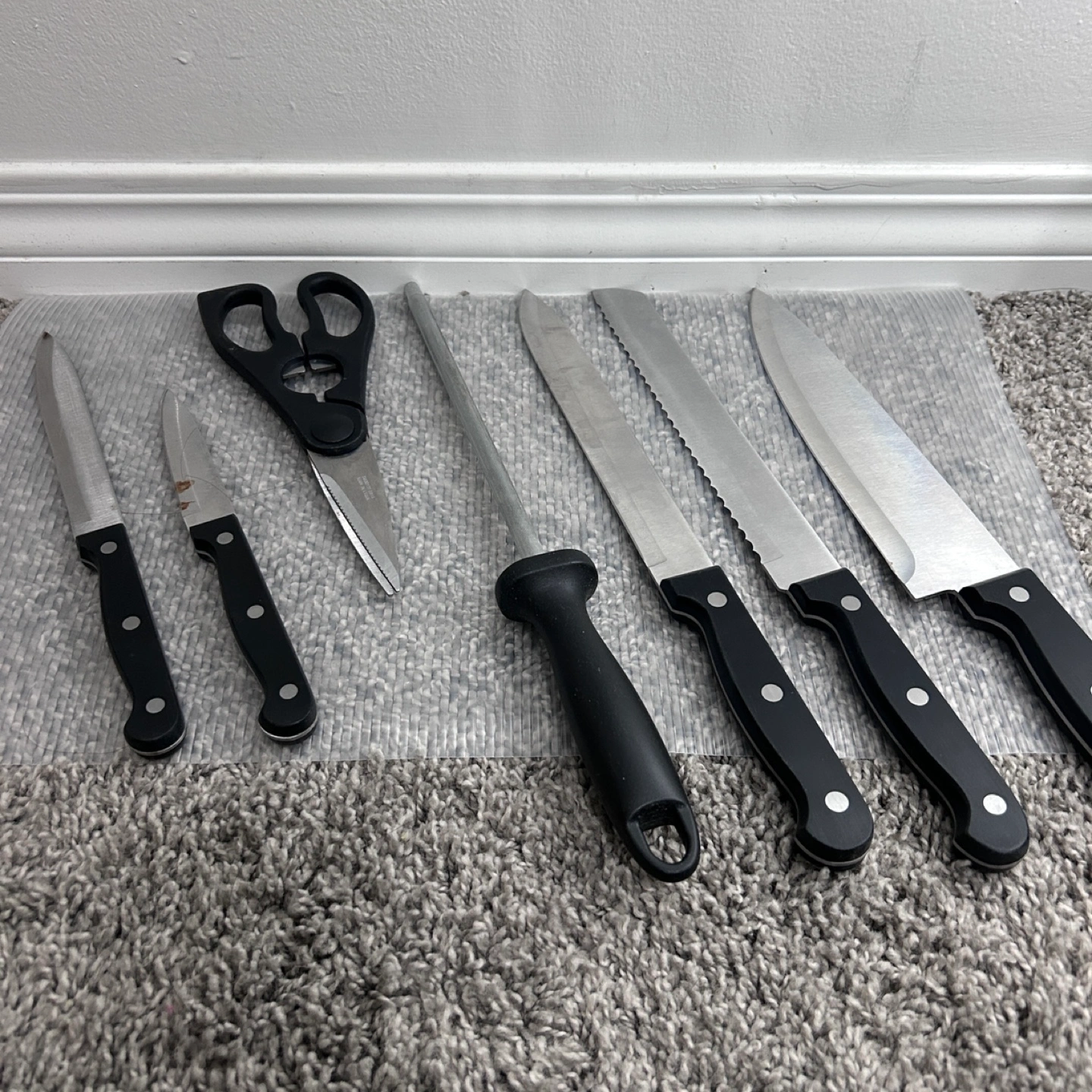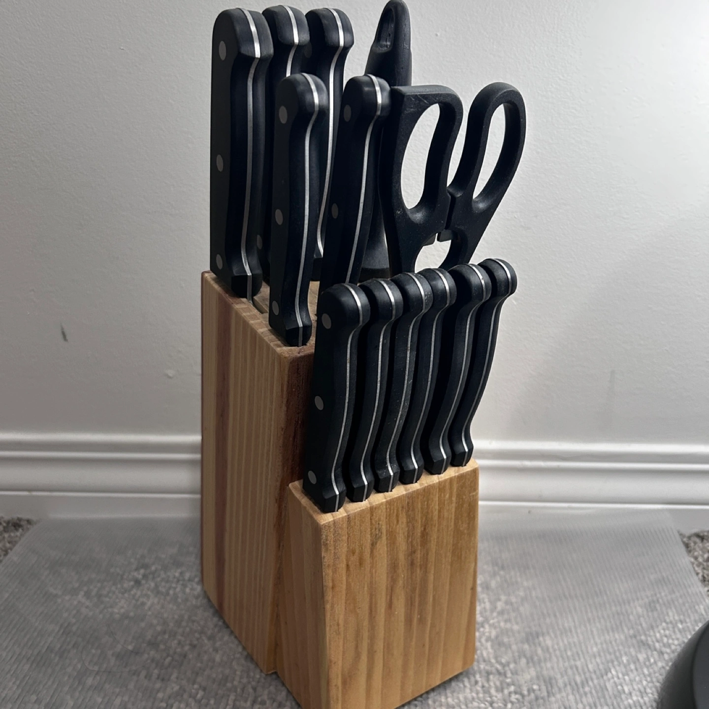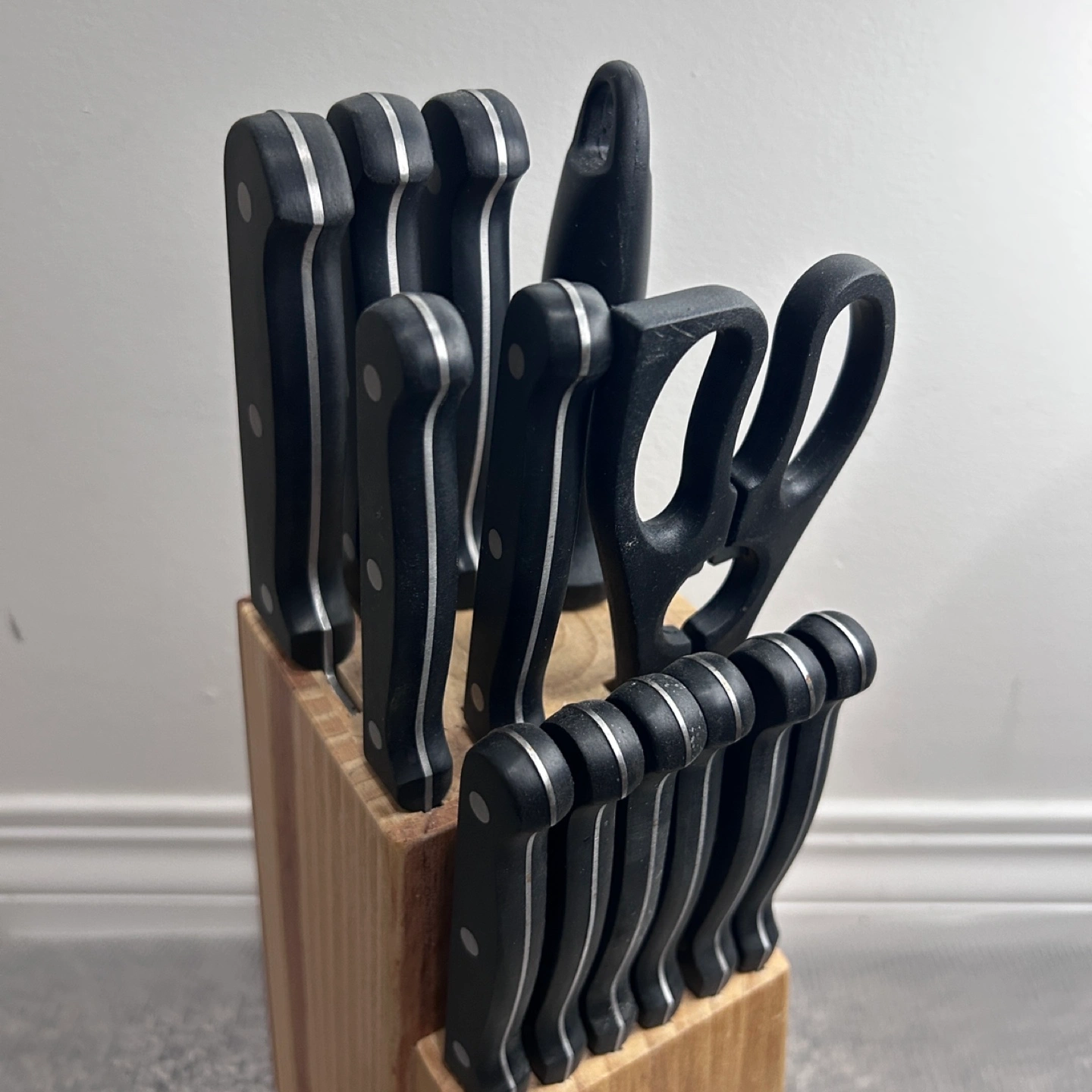 Kitchen knife set with block. Includes steak knives, a bread knife, a chef's knife, paring knives, a sharpening steel, kitchen shears, and a wooden block.