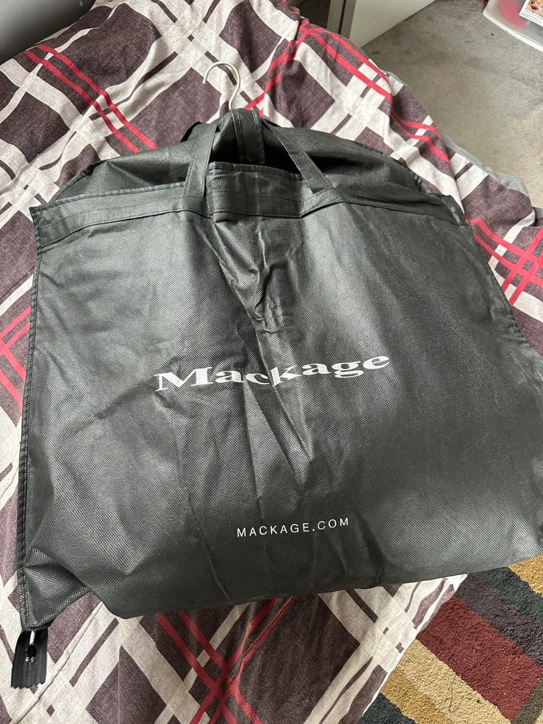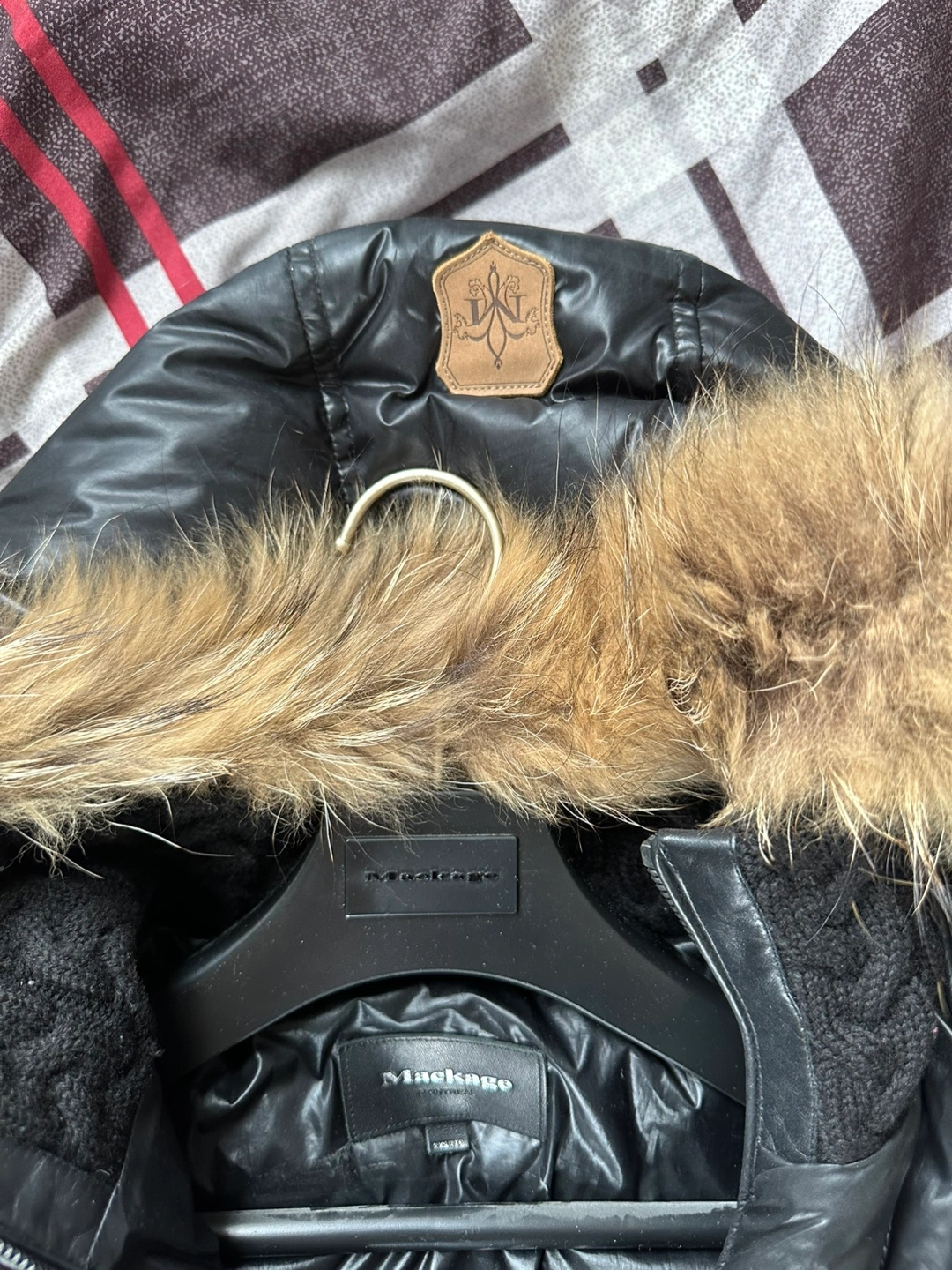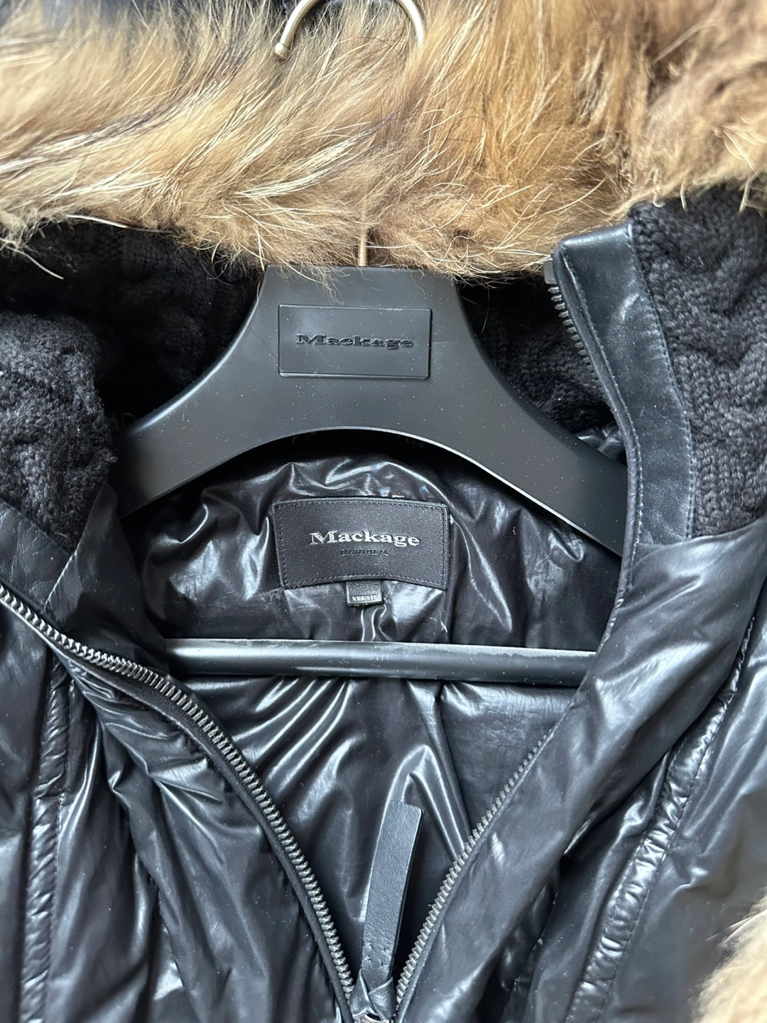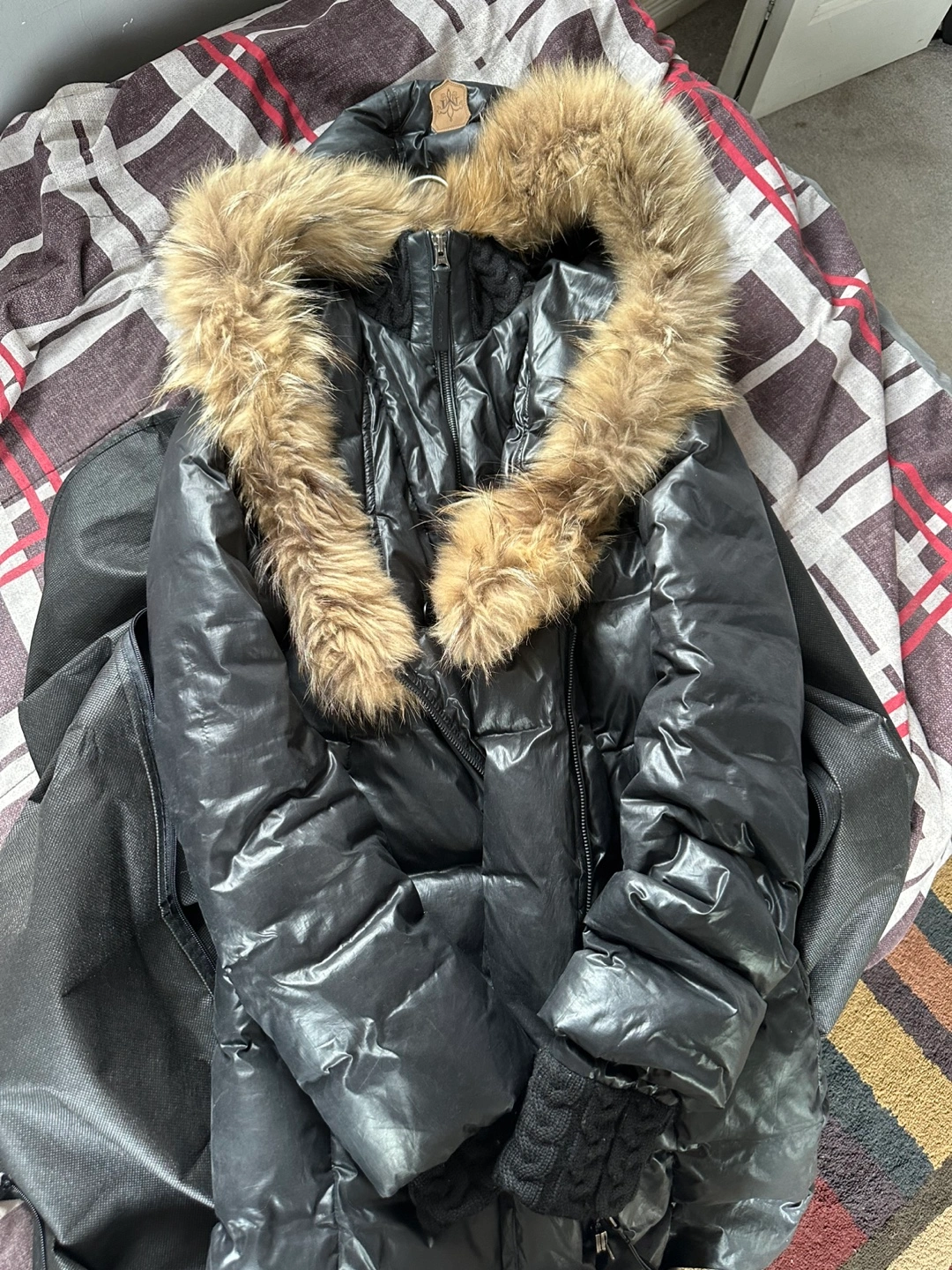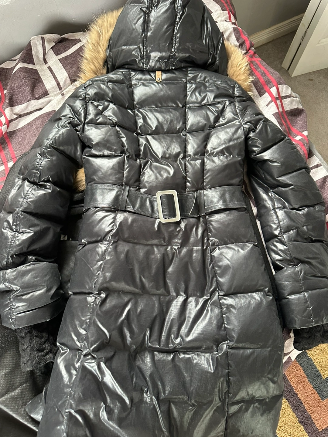 Black down puffer jacket with fur hood, belt, and long sleeves. Includes a storage bag. Worn for one season then put in storage