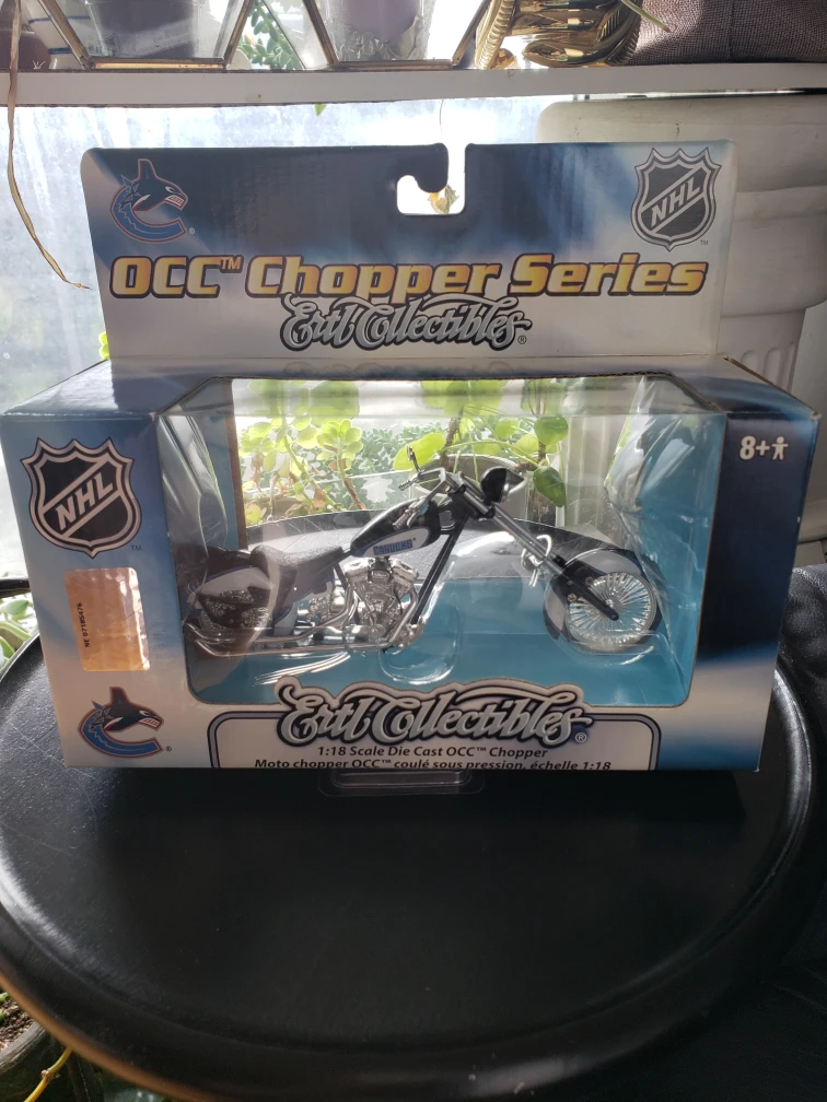1:18 scale die cast OCC Chopper, Vancouver Canucks. Comes in original packaging. Metal and plastic. collectible die cast model, serially numbered, from 2006
