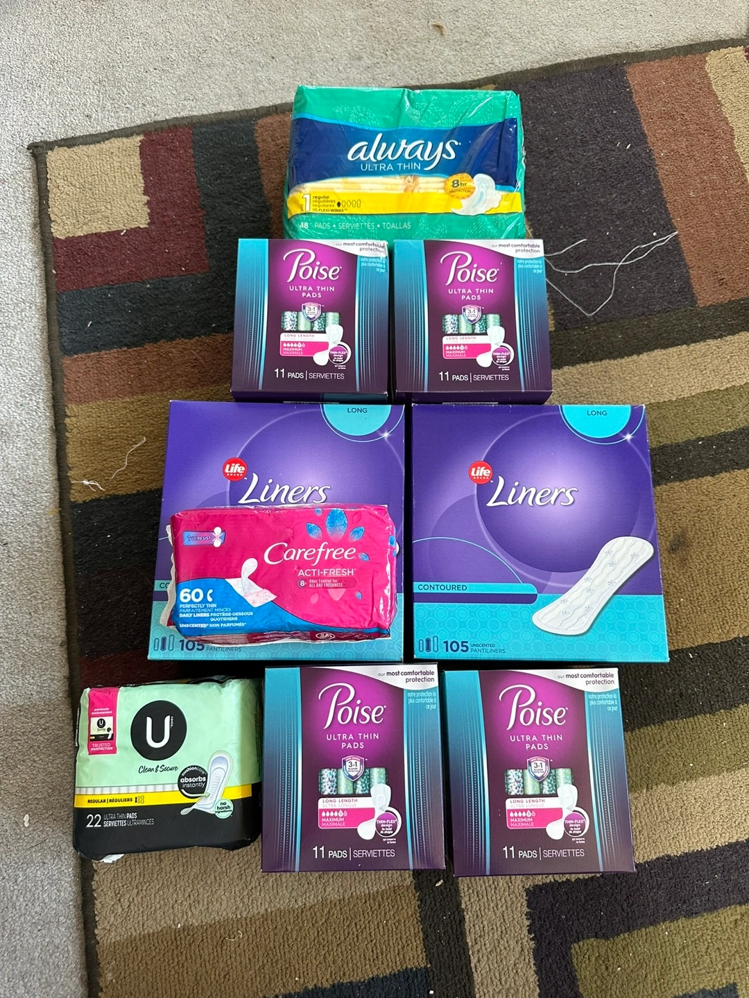 Bulk pack of feminine hygiene products. Includes Always, Poise, Carefree, and U brands. All unopened.
