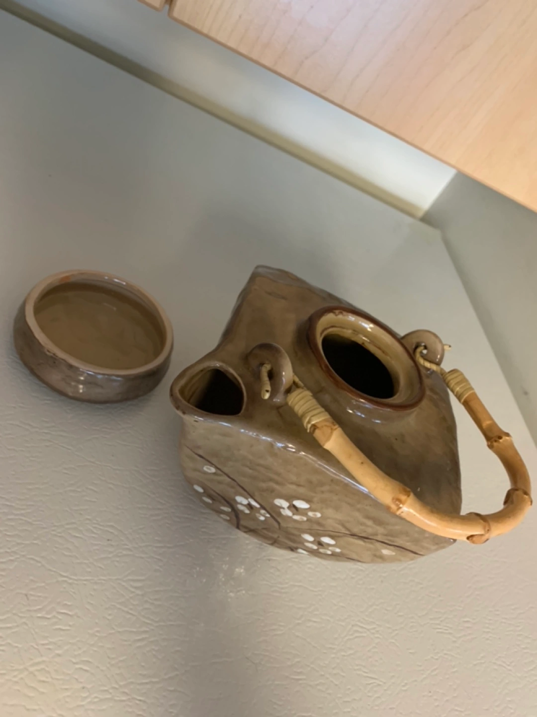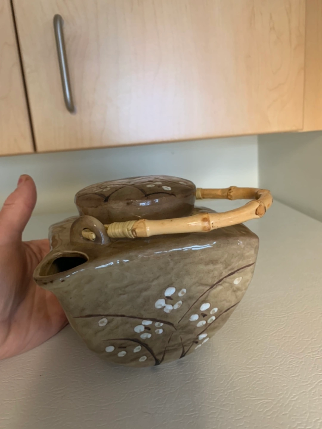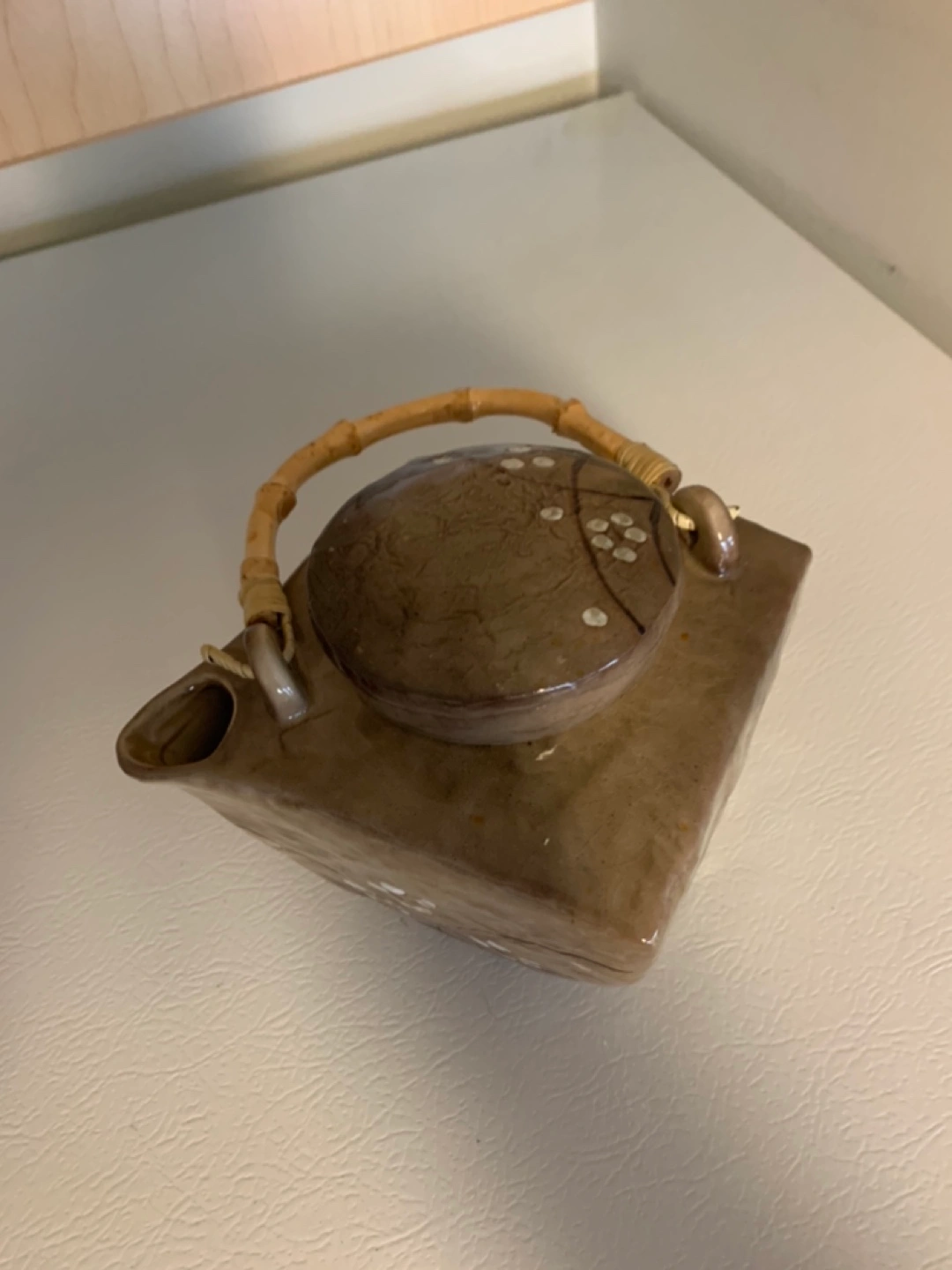 Square-shaped teapot with bamboo handle and lid. Features a floral pattern and comes with a matching saucer.