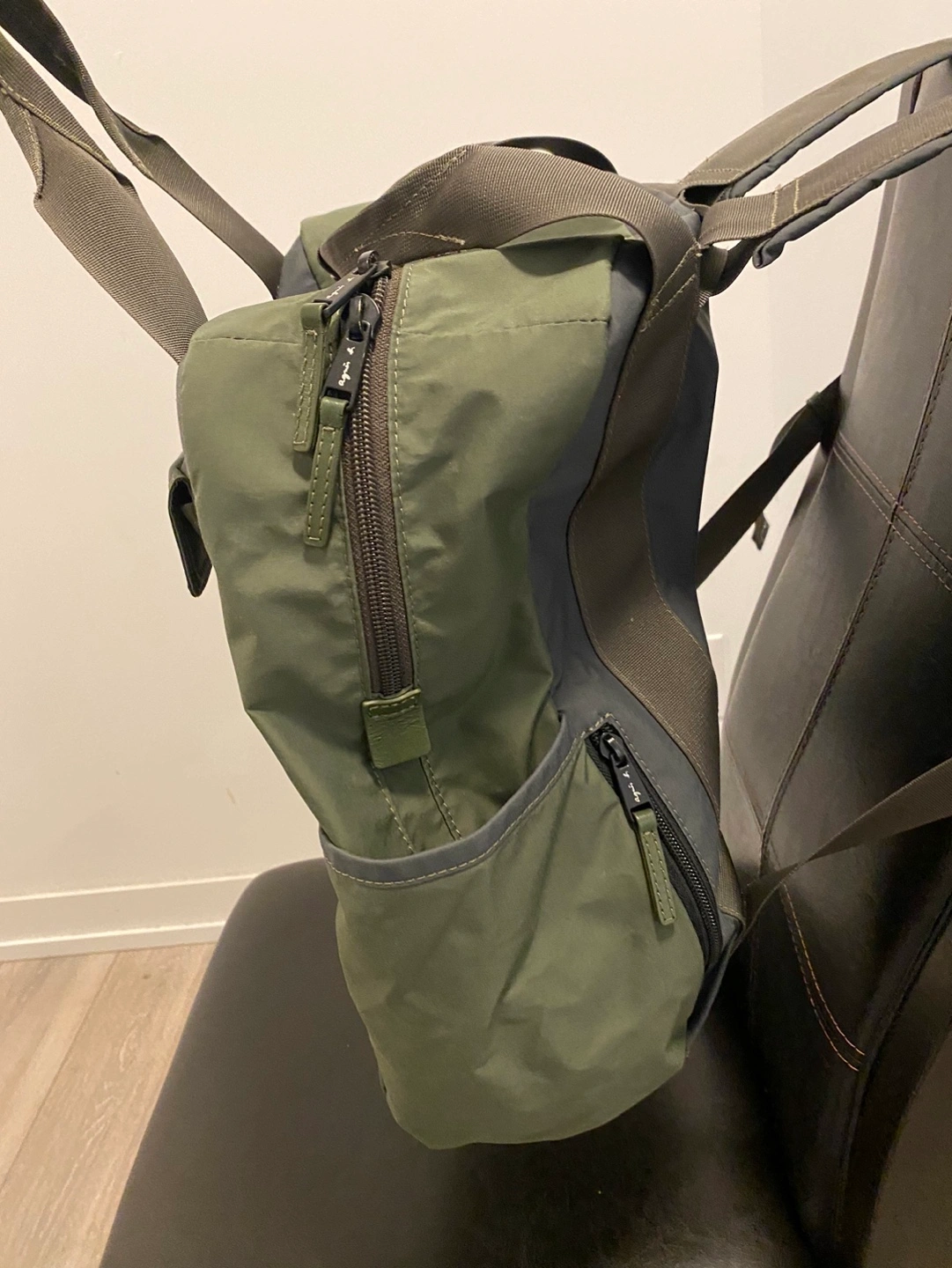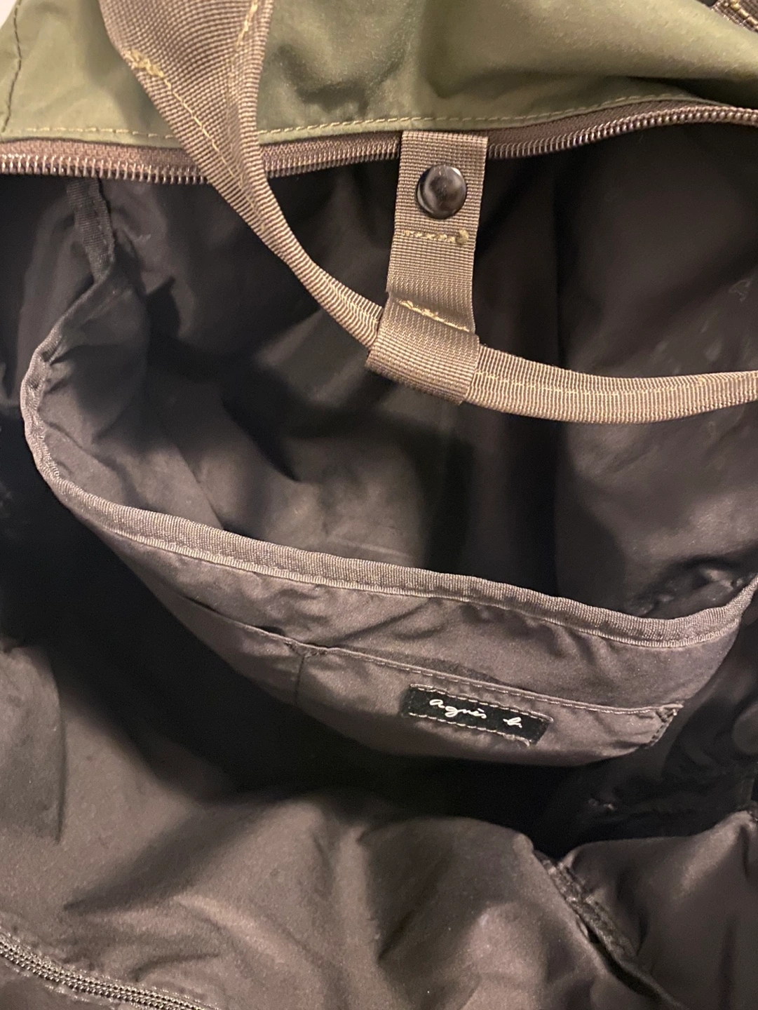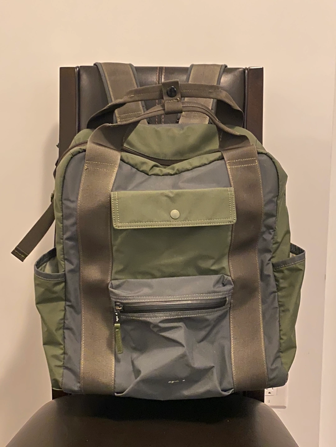 Agnes B Backpack in khaki green, purchased in 2021 from the Agnes B Flagship store in Paris. It’s in very good condition and has mainly been used for casual outings. Details: - Model: O066VNP8 - Color: Khaki Green - Material: Hi-Breathetech (highly waterproof and breathable) - Dimensions: 14” (L) x 16” (H) x 6” (D) Features: * Two top handles with a snap fastener * Adjustable straps at the back * One zip pocket and one pocket with snap-fastened flap on the front * Patch pockets on the sides * Three interior pockets (one zipped) * Vertical zipped pocket on the back * Waterproof front zip pocket and a double slider main zip It’s lightweight, fits 15 inch laptops + pads, and is very practical for everyday use. Feel free to message me if you’re interested or have any questions.
