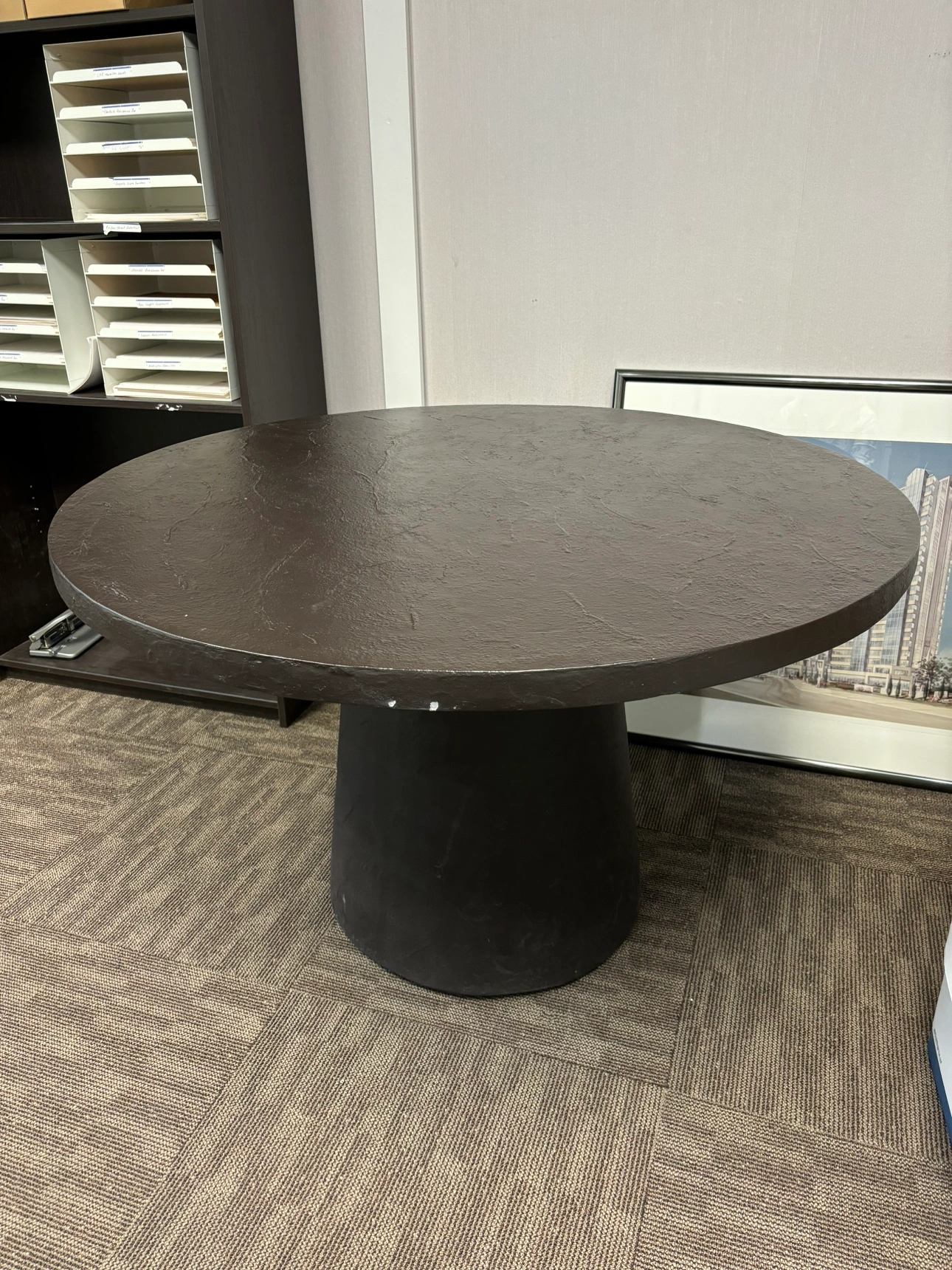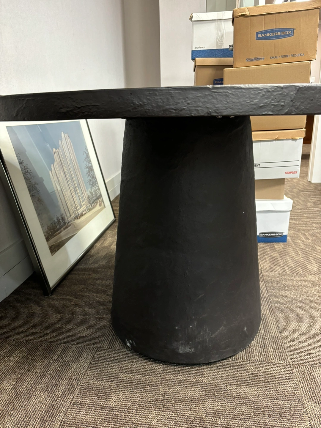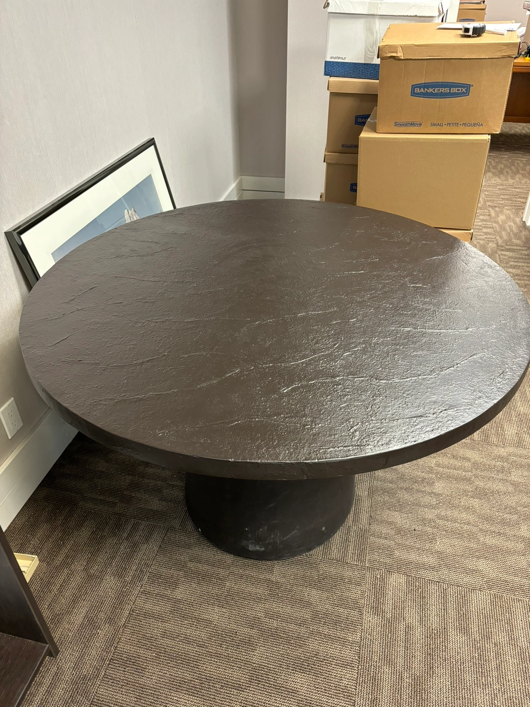 309Round dining table. Black slate top. Pedestal base. From Crate and Barrel, currently listed for 1,300. Some small chips and scuff, but otherwise in great condition. Pickup only.