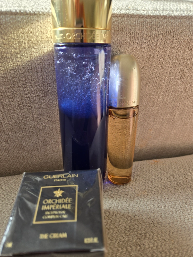 Orchideé Imperiale Lotion and serum, both in the Orchidee Imperiale line. Lotion is full size, 125 ml. serum is travel size. also Creme Exception 7ml.